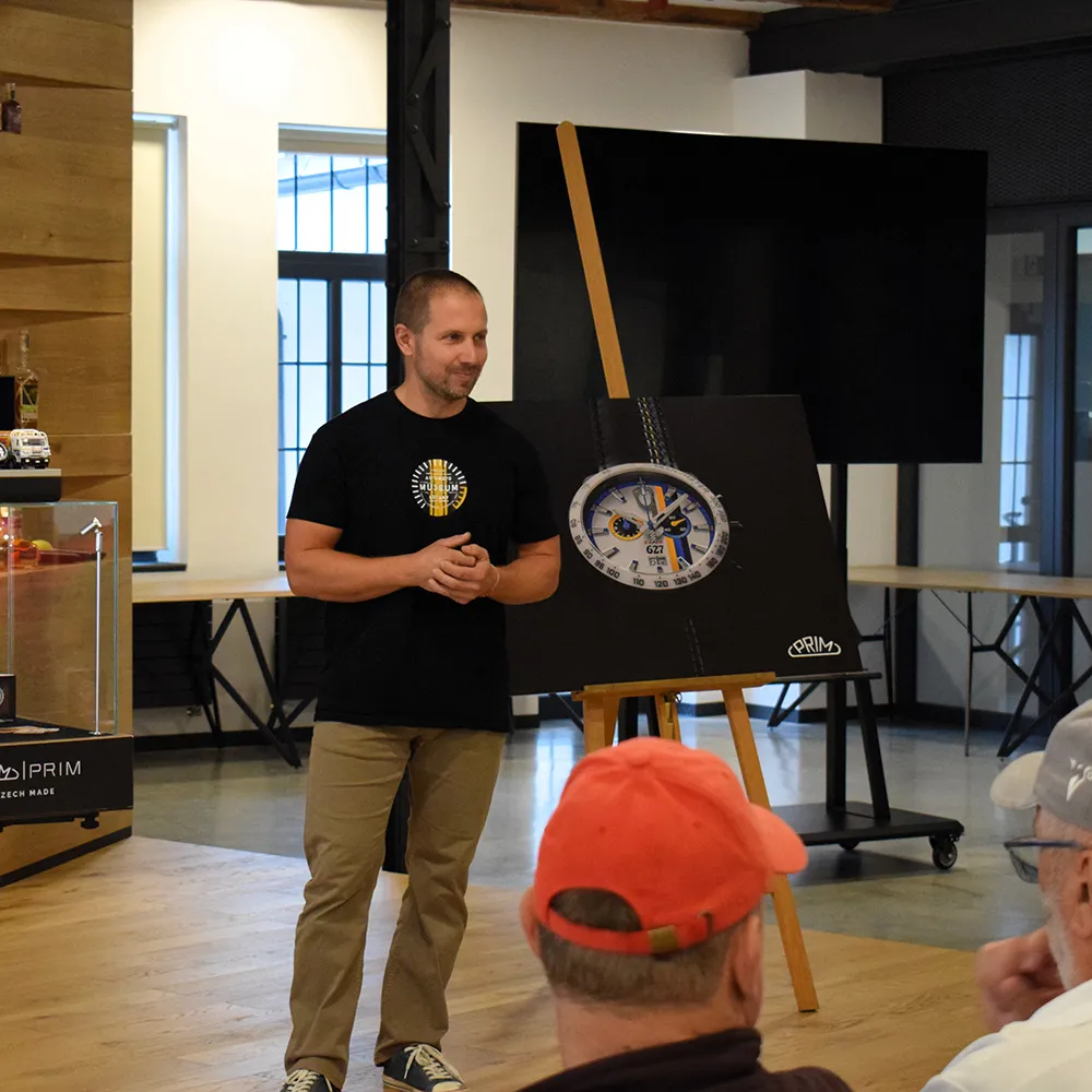 Prostor Automoto Museum Lučany poskytl ideální kulisu — mezi veterány a exponáty se hodinky představily v kontextu, který jejich motivům výborně sedí. Hosté mohli zblízka obdivovat pečlivé zpracování: detaily číselníku inspirované palubní deskou, rytiny odkazující na rok 1985 a limitované označení každého kusu.