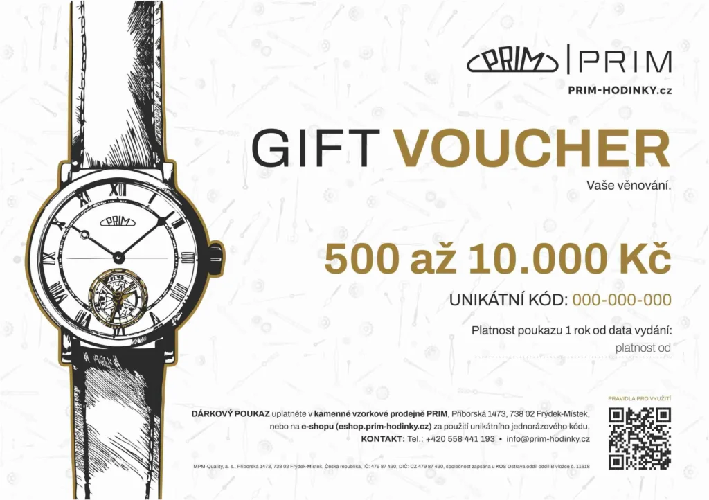 Rádi byste své nejbližší, přázelé, firemní partnery či zaměstnance obdarovali hodinkami PRIM a nevíte jaký model vybrat? Právě pro Vás jsme připravili speciální dárkové poukazy na zboží značky PRIM. Vyberte si z dárkových poukazů v nominální hodnotách 500 – 10 000 Kč na našem e-shopu. Obdarovaný si může vybrat zboží PRIM, které přesně odpovídá jeho potřebám.