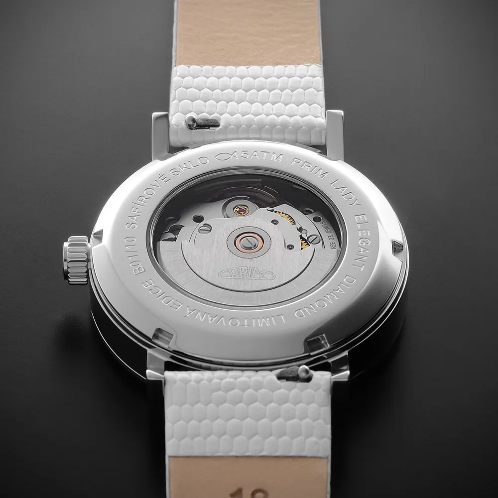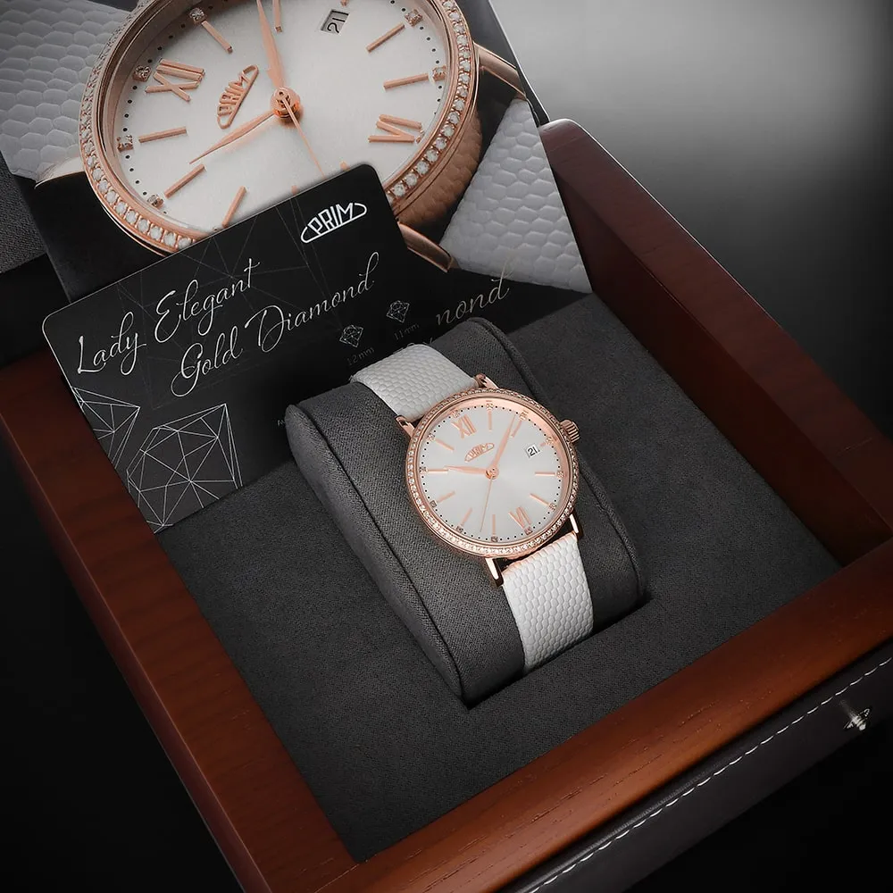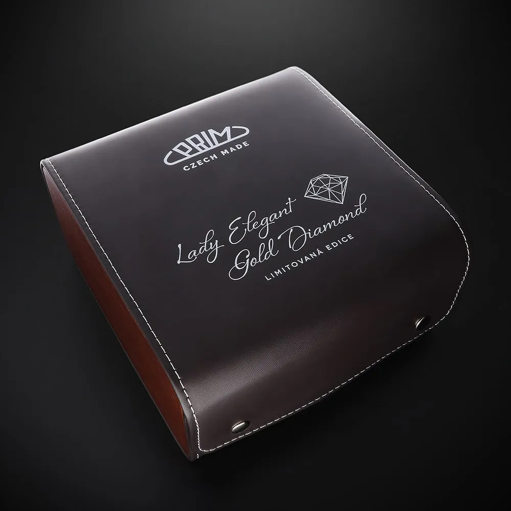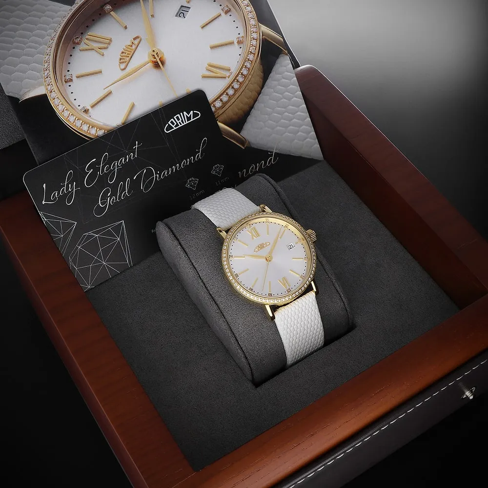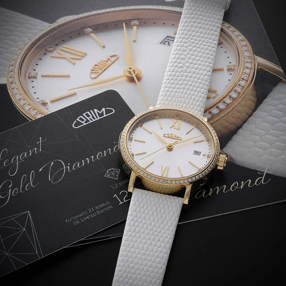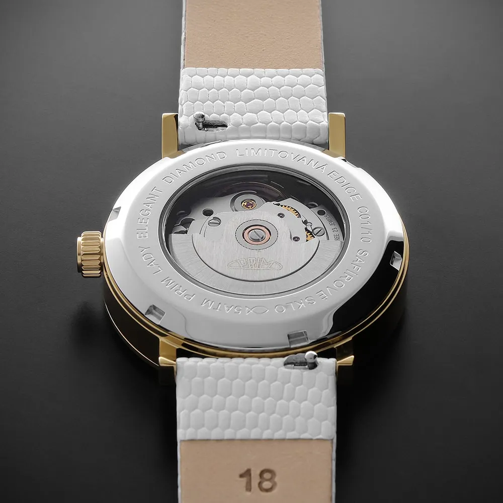 Limitovaná originální edice PRIM Lady Elegant Gold Diamond vyzařuje klasickou eleganci, podmaňující si srdce žen. Tyto automatické hodinky jsou stvořeny pro všechny dámy, které od svých doplňků očekávají nejen trendy vzhled, ale i vysokou kvalitu. Hodinky jsou vyrobeny v celkovém počtu 40ti kusů, 10 kusů každé verze a jsou individuálně číslovány.