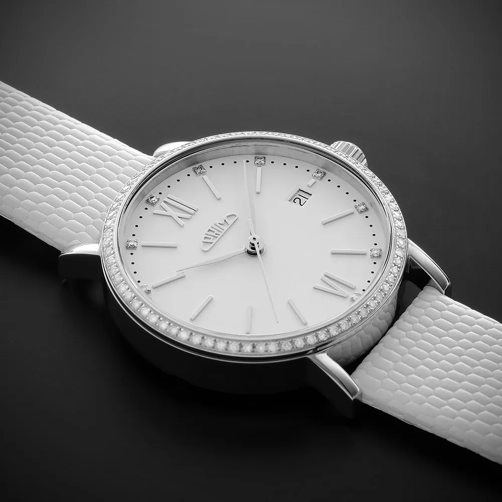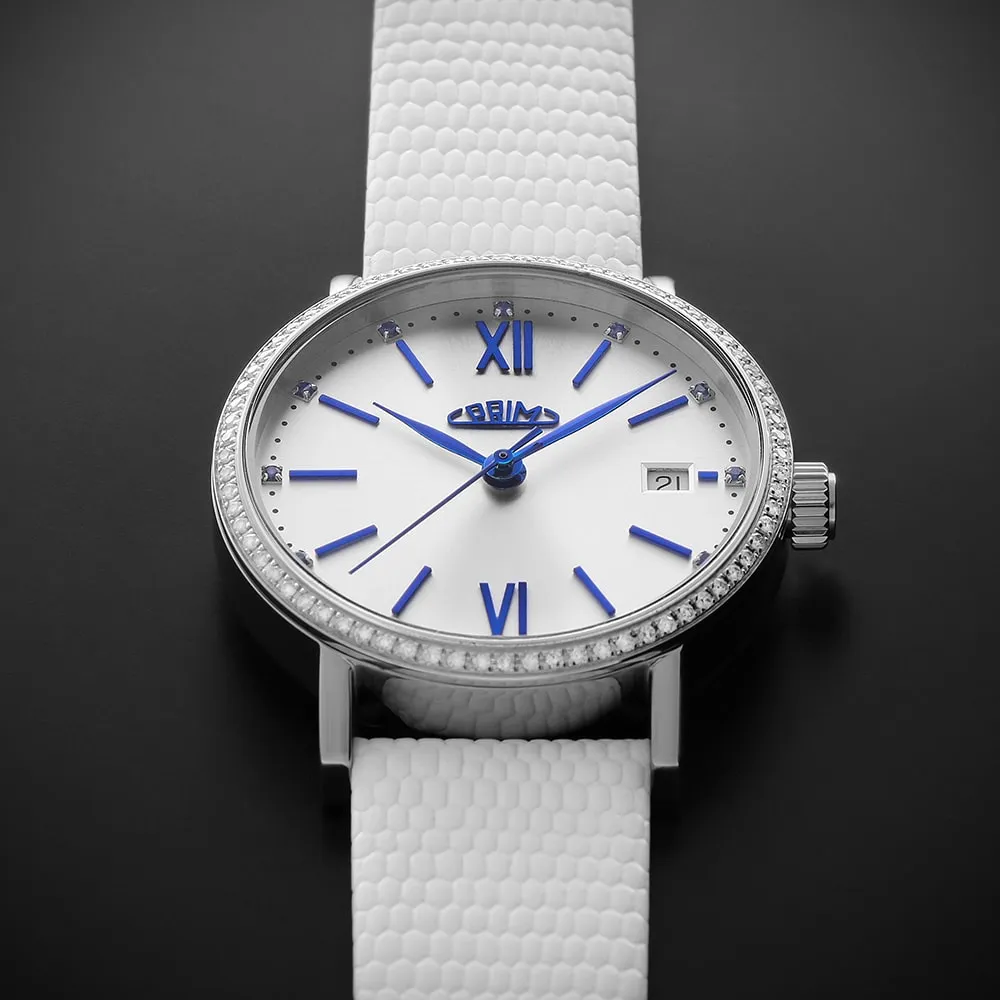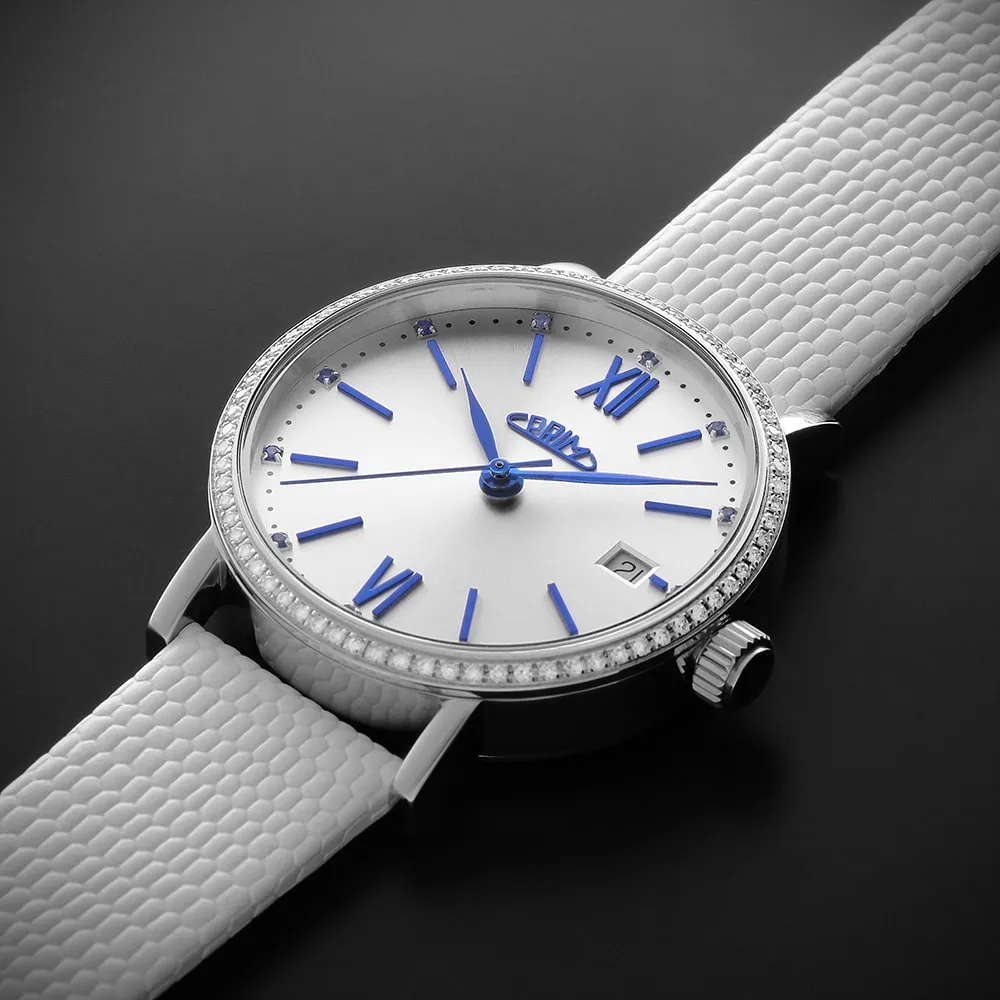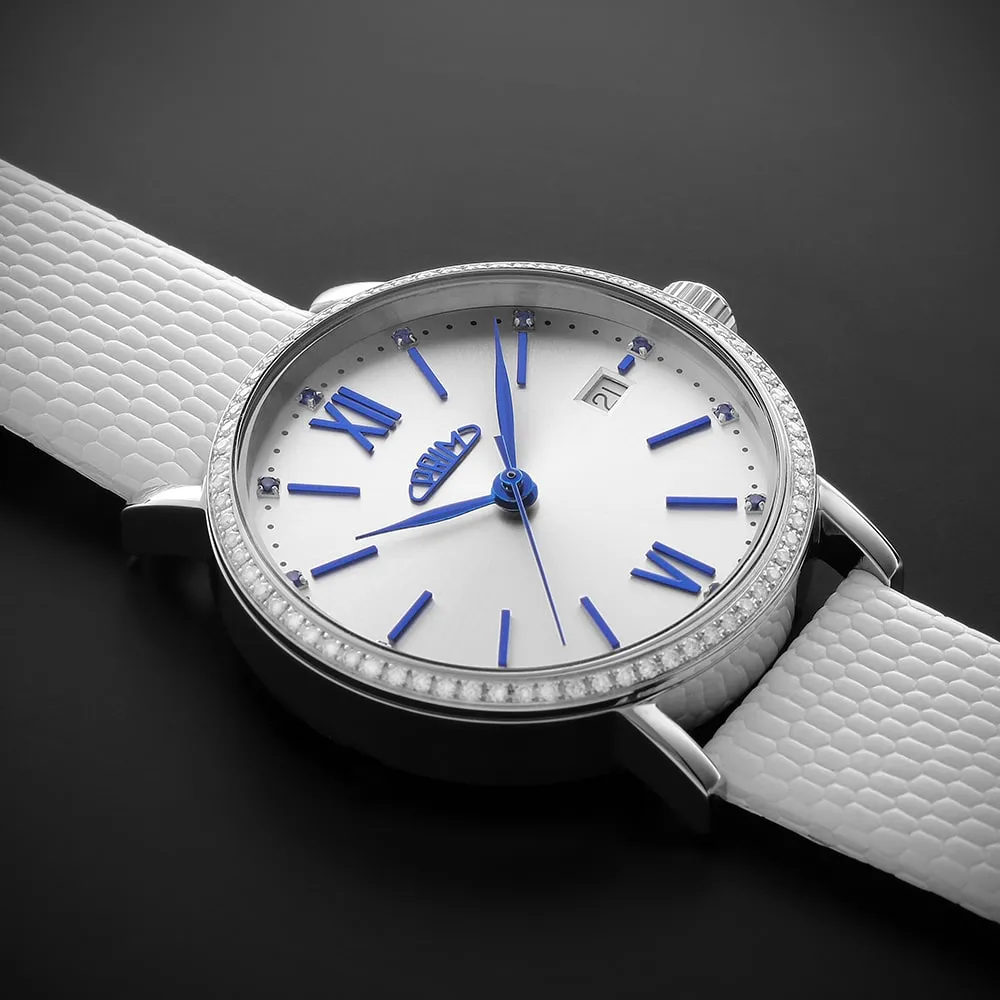 Pod plochým safírovým sklíčkem s antireflexní a anti-touch úpravou se nachází elegantní broušený nebo hladký číselník, doplněný jemnými ručně aplikovanými indexy osazené 12ti kusy 1.2 SI1 (round brilliant cut) diamanty nebo modrými safíry, dle verze hodinek. Hodinky mají rovněž ukazatel aktuálního data umístěn na pozici 3. hodin a zdobí je ručičky ve tvaru listu, jejichž elegantní lesk přináší do celého vzezření nádech jemnosti. Model je dodáván s vysoce kvalitním koženým řemínkem s ještěřím vzorem s ocelovou motýlovou sponou v barvě pouzdra. Hodinky jsou dodávány v luxusní dřevěné krabičce spolu se záručním listem a servisní kartou.