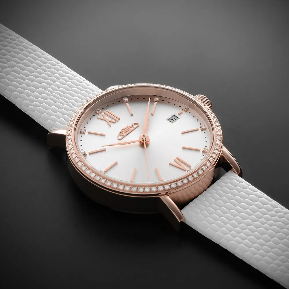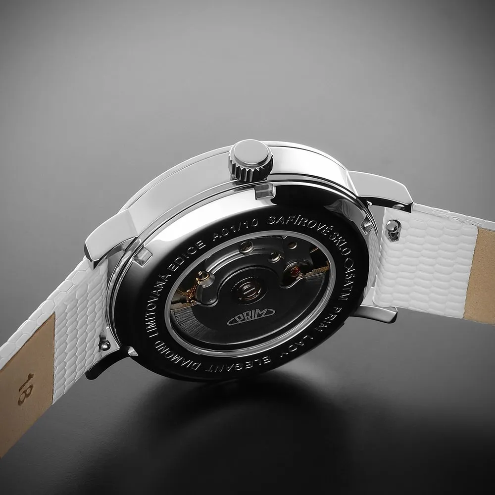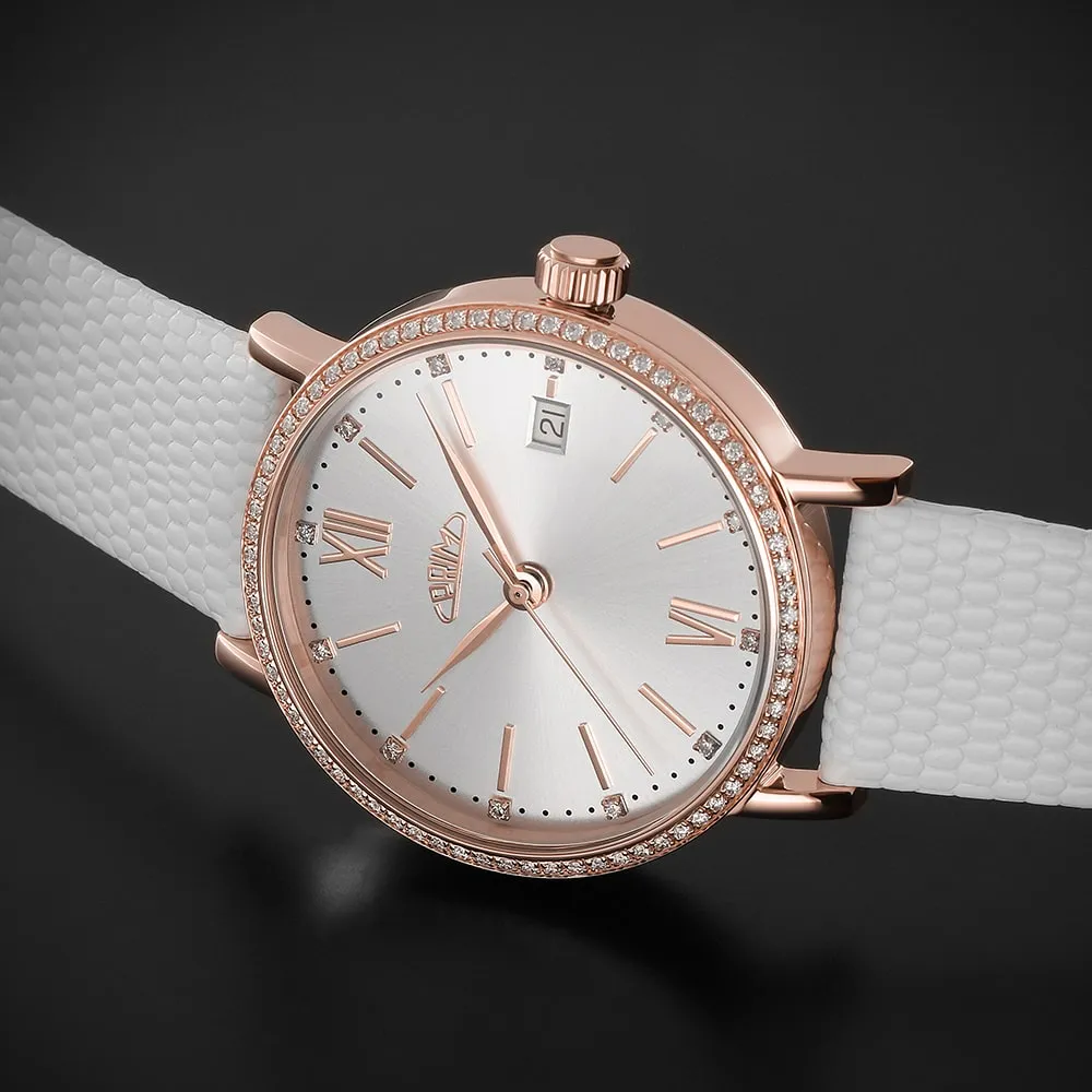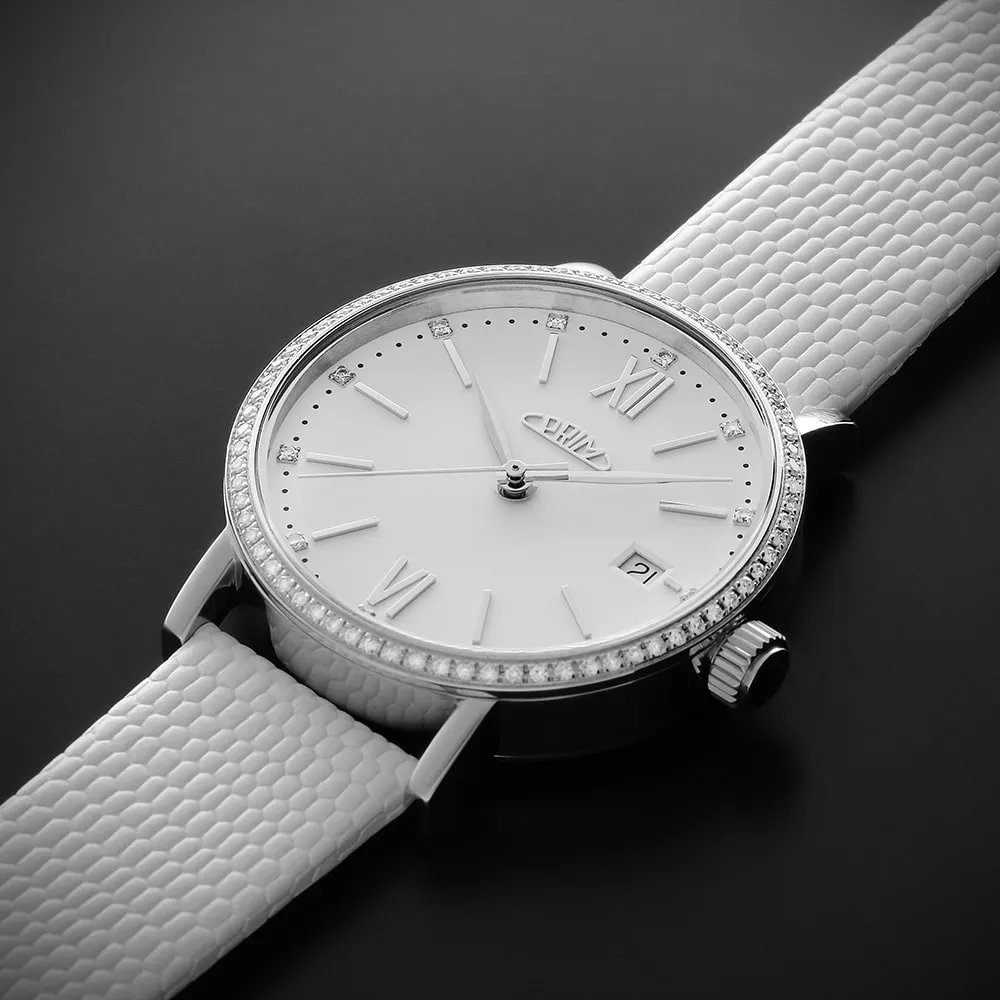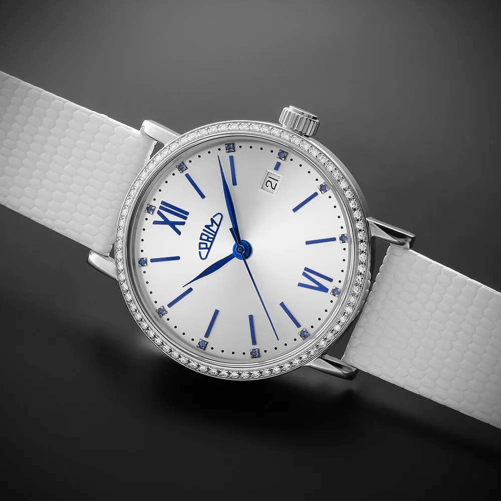 Pod plochým safírovým sklíčkem s antireflexní a anti-touch úpravou se nachází elegantní broušený nebo hladký číselník, doplněný jemnými ručně aplikovanými indexy osazené 12ti kusy 1.2 SI1 (round brilliant cut) diamanty nebo modrými safíry, dle verze hodinek. Hodinky mají rovněž ukazatel aktuálního data umístěn na pozici 3. hodin a zdobí je ručičky ve tvaru listu, jejichž elegantní lesk přináší do celého vzezření nádech jemnosti. Model je dodáván s vysoce kvalitním koženým řemínkem s ještěřím vzorem s ocelovou motýlovou sponou v barvě pouzdra. Hodinky jsou dodávány v luxusní dřevěné krabičce spolu se záručním listem a servisní kartou.