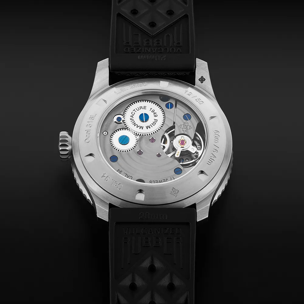 Prosklené zadní dýnko odhaluje manufakturní strojek PRIM s ručním nátahem.