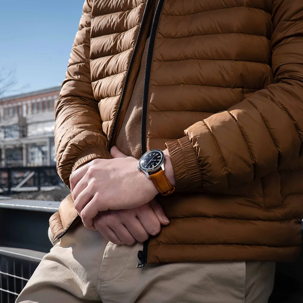 Kvalitní ocelové tělo hodinek zdůrazňuje odolnost a zároveň denní nositelnost tohoto modelu. K barvě oceli atraktivně kontrastuje matný černý číselník s jemnými perleťovými odlesky. Z něj vystupují výrazně žluté indexy a ručky, které hodinkám dodávají skvělou čitelnost a sportovní vzhled. Otočný kroužek se sestupnou stupnicí a luminiscenčním bodem nejen zdobí, ale také usnadňuje měření časových intervalů.