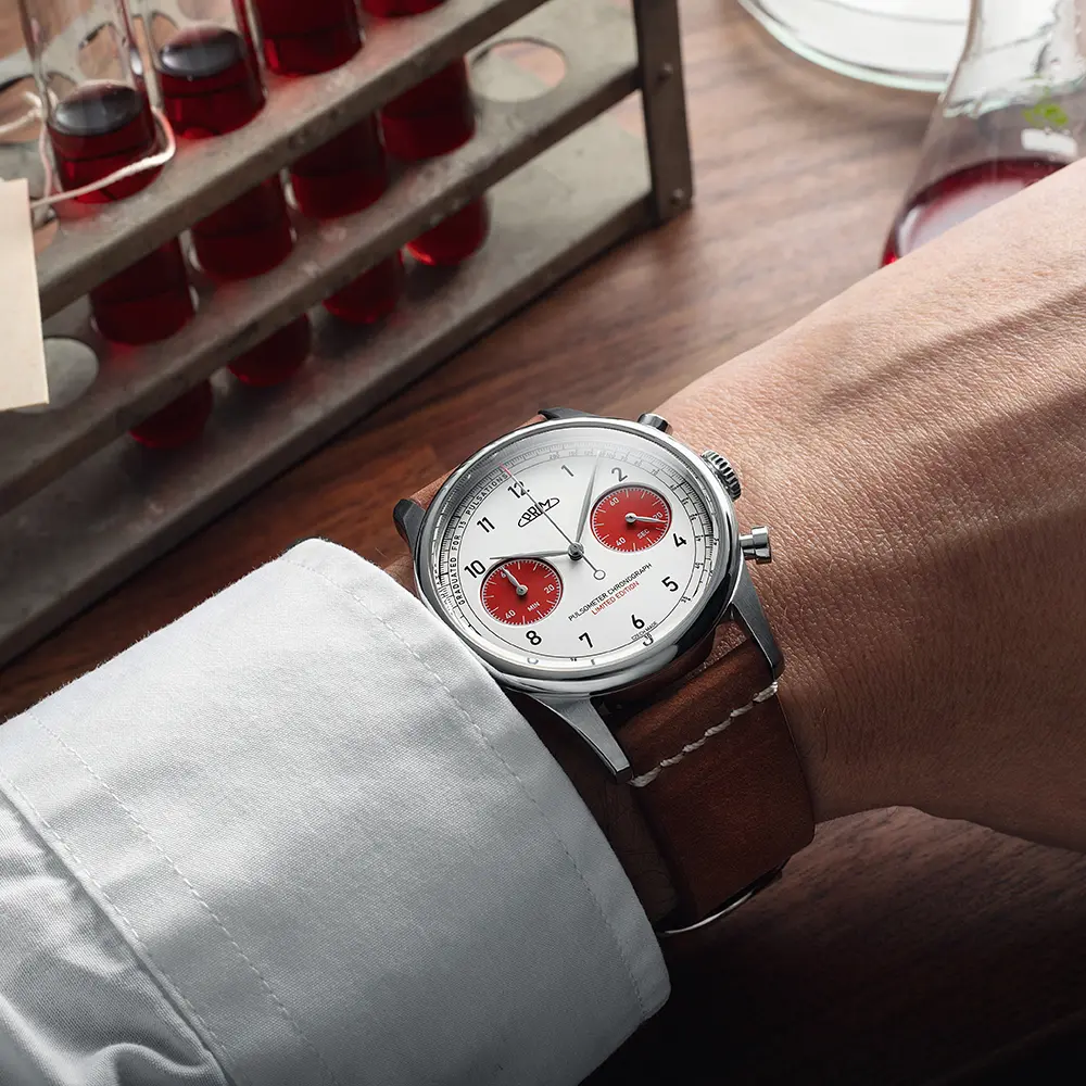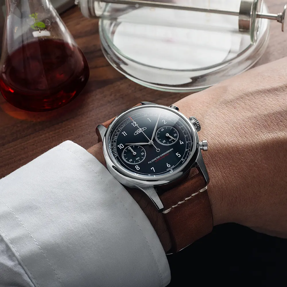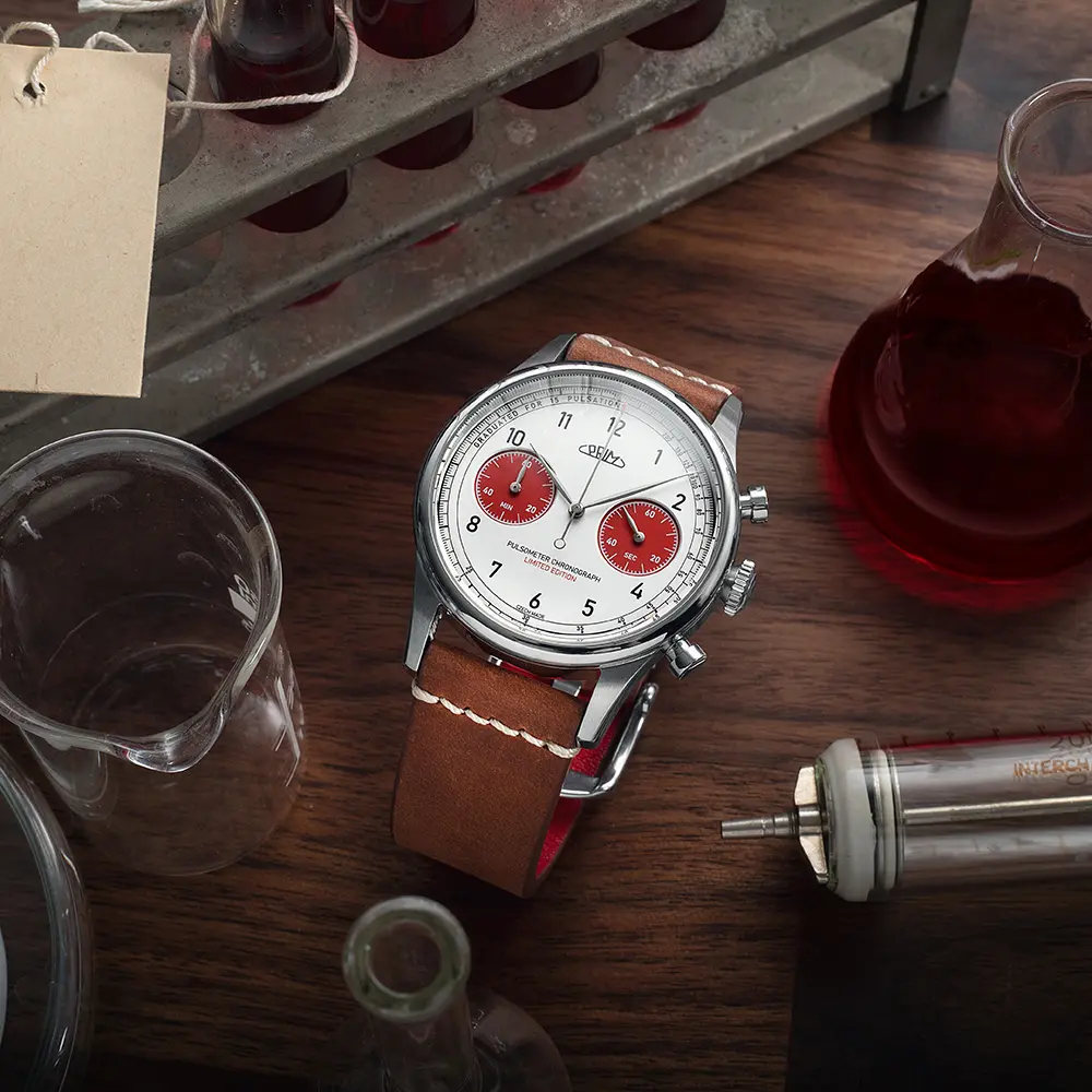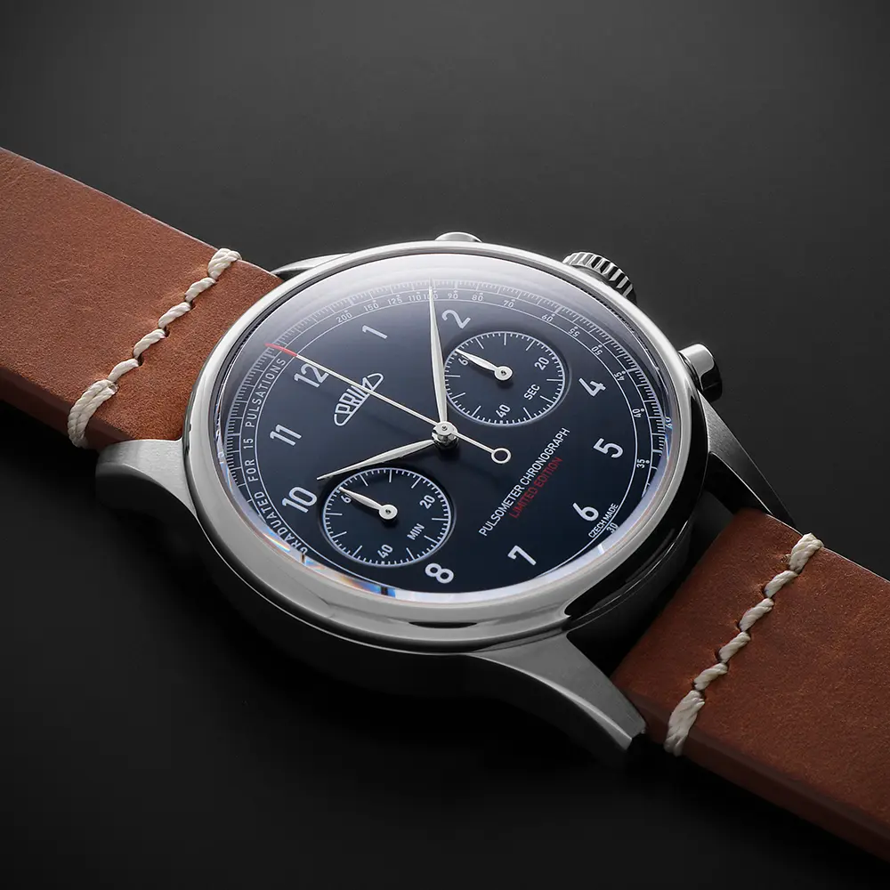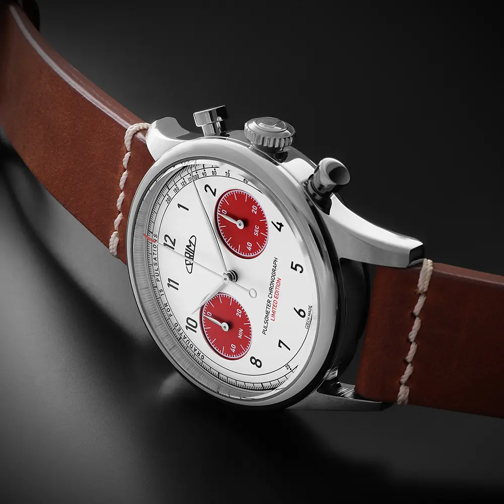 K 150ti letému výročí vznikl ve spolupráci s našimi designéry chronograf opatřen tzv. pulsometrickou stupnicí umožňující snadné orientační měření srdečního tepu. Funkce pulsometru je velmi prostá. Po stisku tlačítka chronografu je potřeba napočítat 15 srdečních tepů a poté chronograf zastavit. Hlavní ručička chronografu ukáže na stupnici vaši aktuální tepovou frekvenci. Tento chronograf lze však použít i jako klasické stopky a to s přesností ¼ sekundy dohromady až maximálně 59 minut 59 sekund.