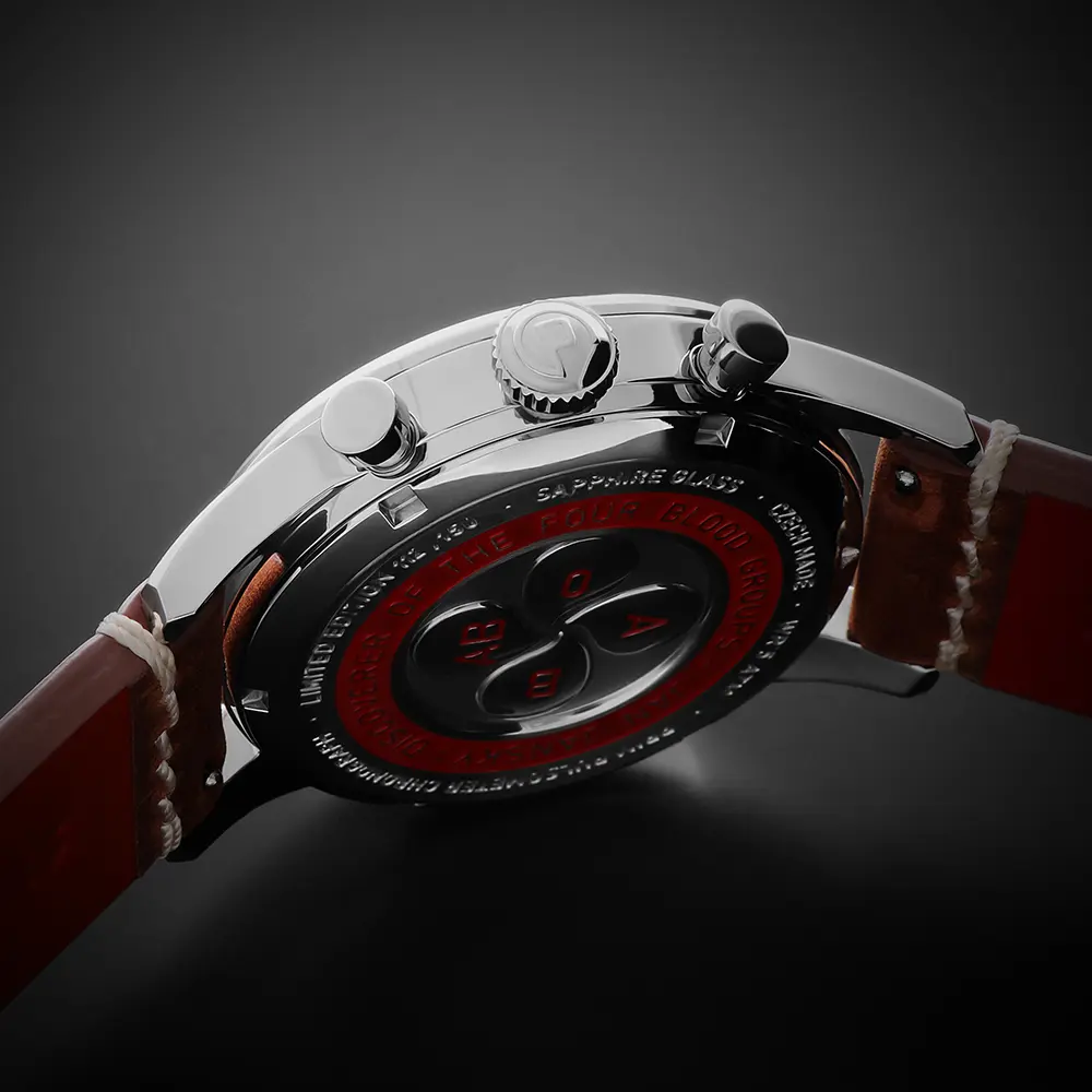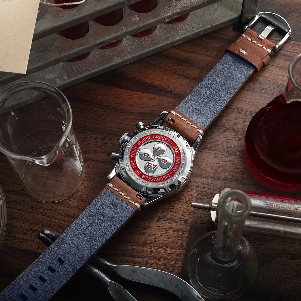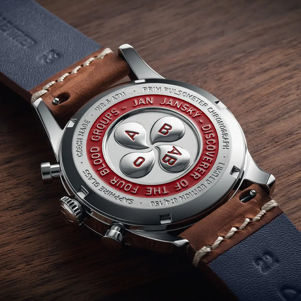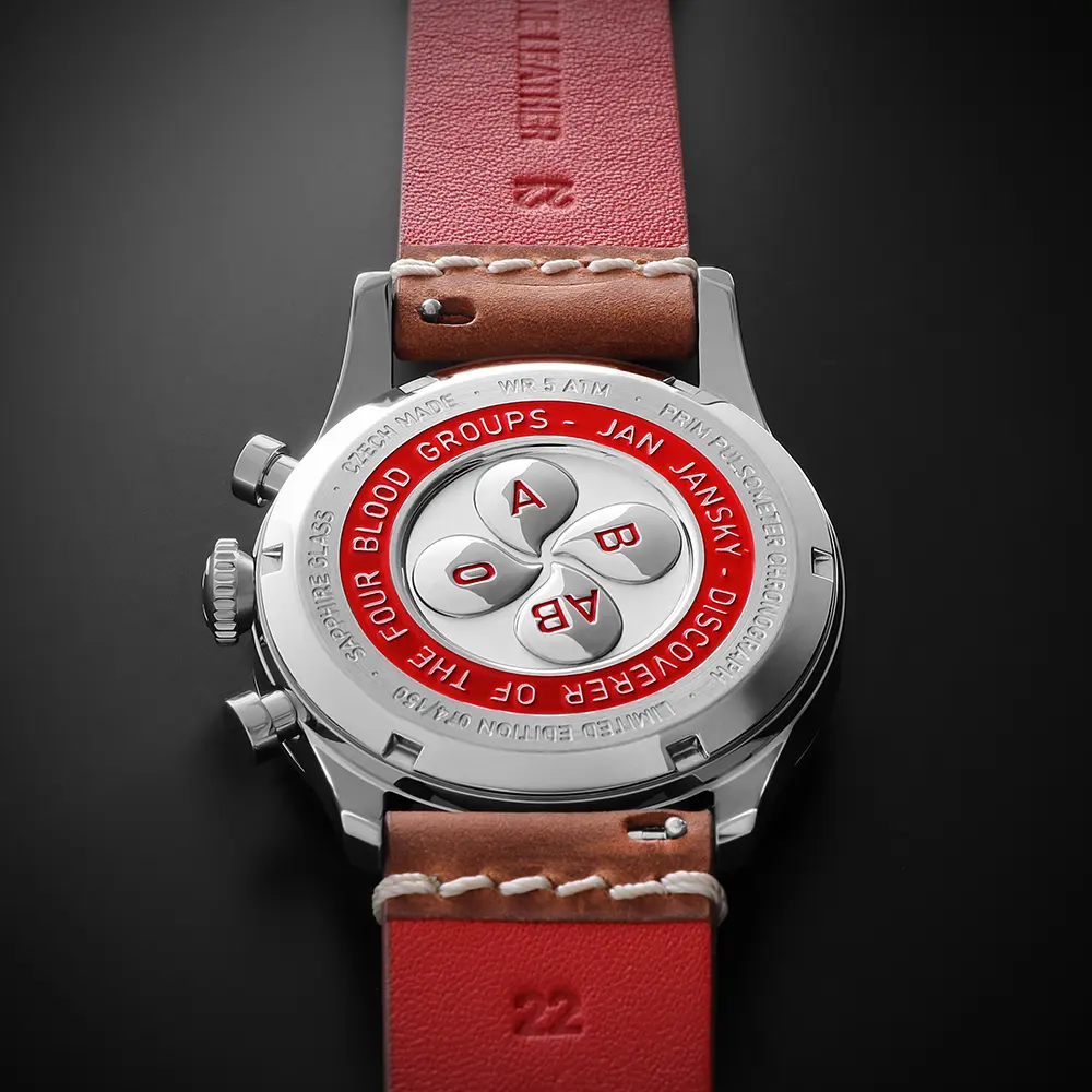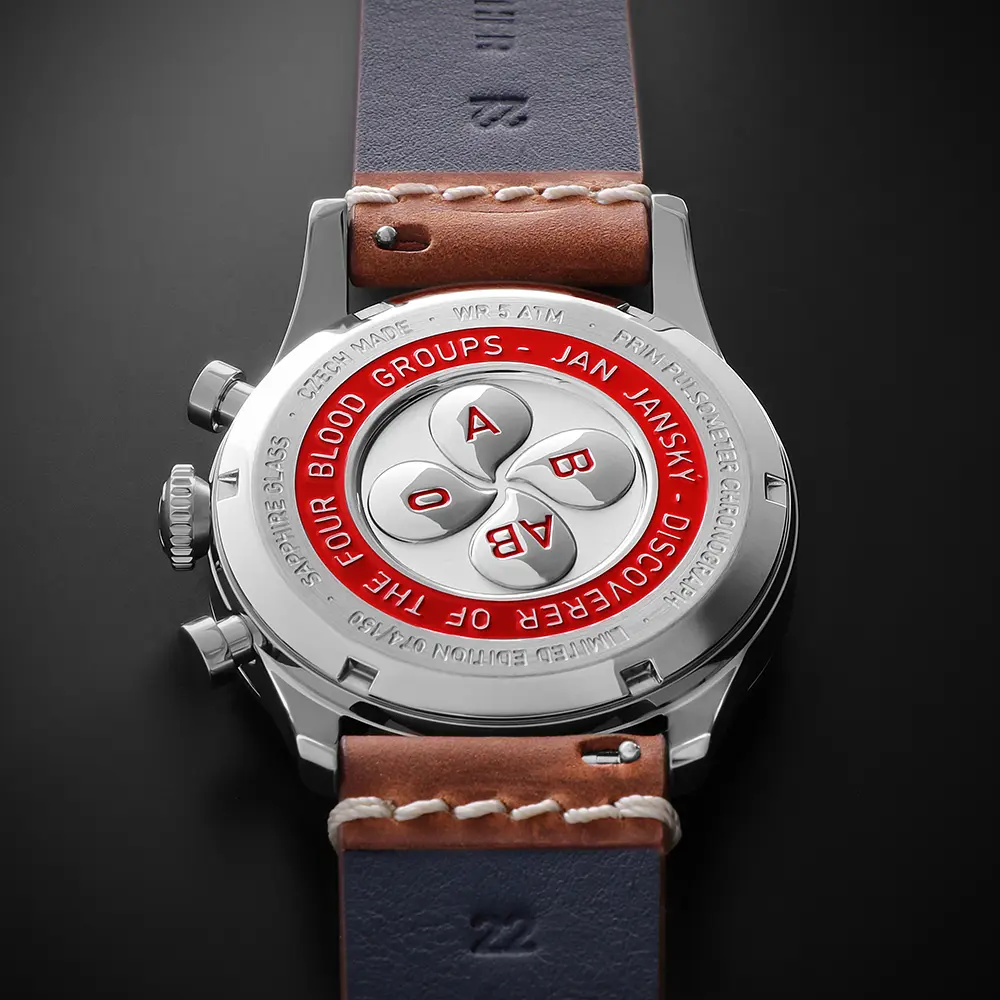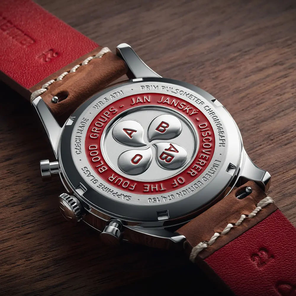 Zvláštní pozornost si zaslouží rovněž víčko hodinek, které jsme tentokrát pojali zcela netradičním způsobem. Díky kombinaci několika aplikovaných výrobních technologií jako kování, frézování, gravírování, leštění a aplikace keramické výplně se nám podařilo vytvořit unikátní podívanou i z druhé strany hodinek. Hlavními znaky jsou reliéfní ražba čtyř kapek krve s označením čtyř krevních skupin a odkaz na 150ti leté výročí narození Jana Janského.