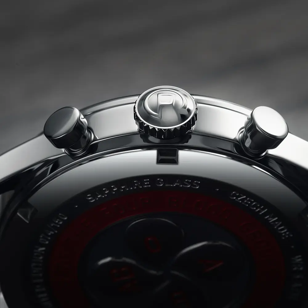 Dalšími prvky jsou pak tvarovaný číselník a tvarovaná hlavní ručička chronografu opatřena protizávažím ve tvaru kroužku a červeným nátěrem na konci nebo konvexní safírové sklo s antireflexní úpravou. Pouzdro bylo vyvinuto speciálně pro tento model a je vyrobeno z nerezové oceli 316L a obsahuje jak leštěné, tak broušené prvky.