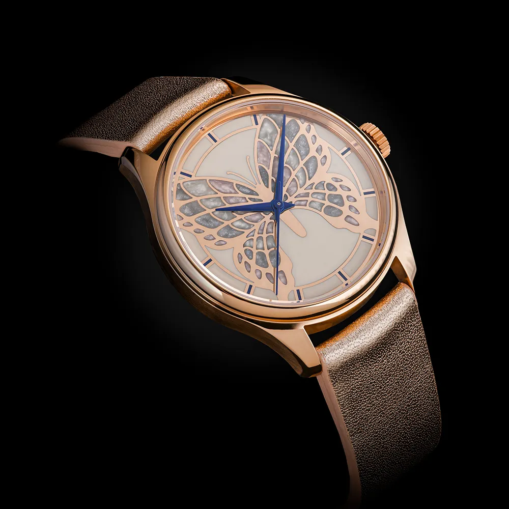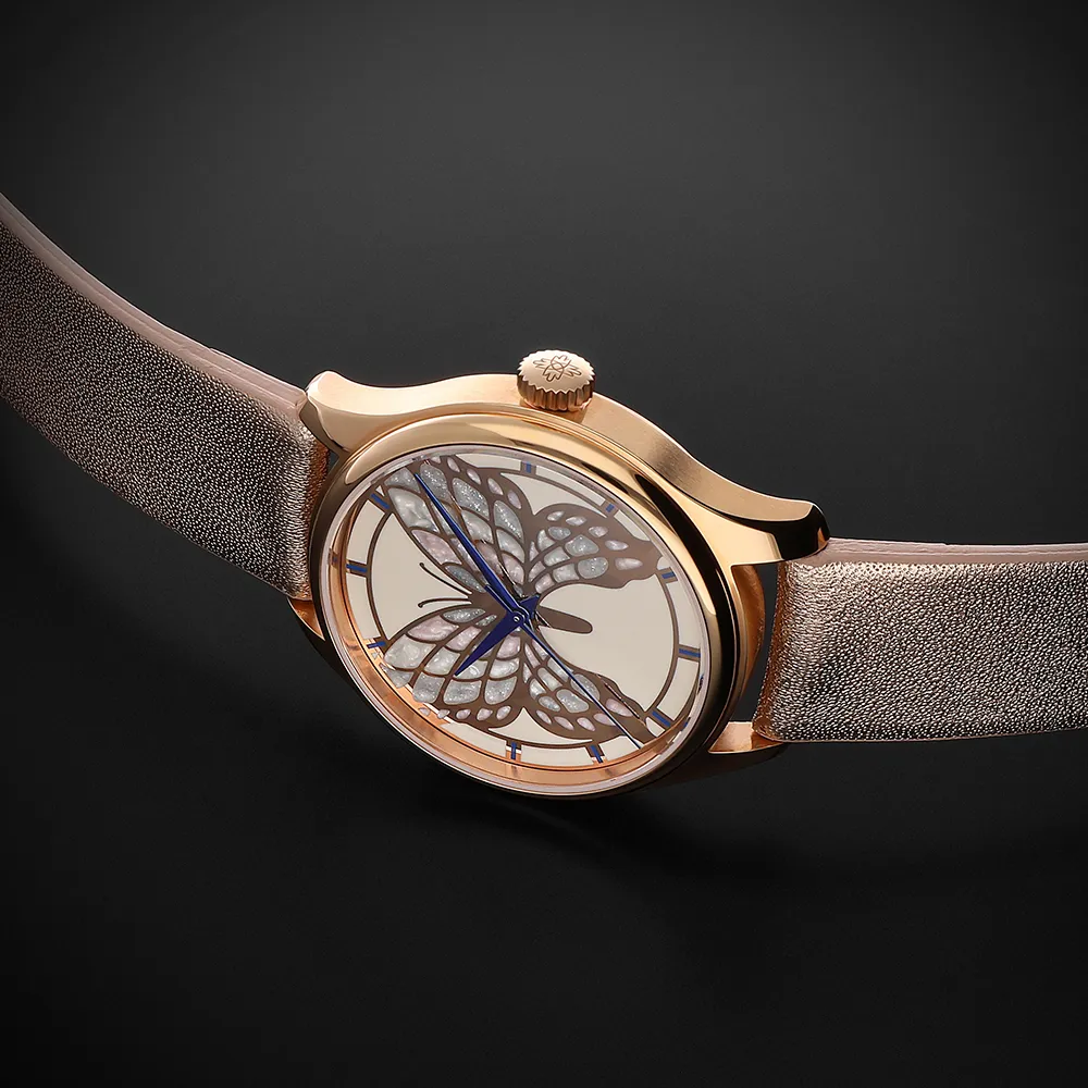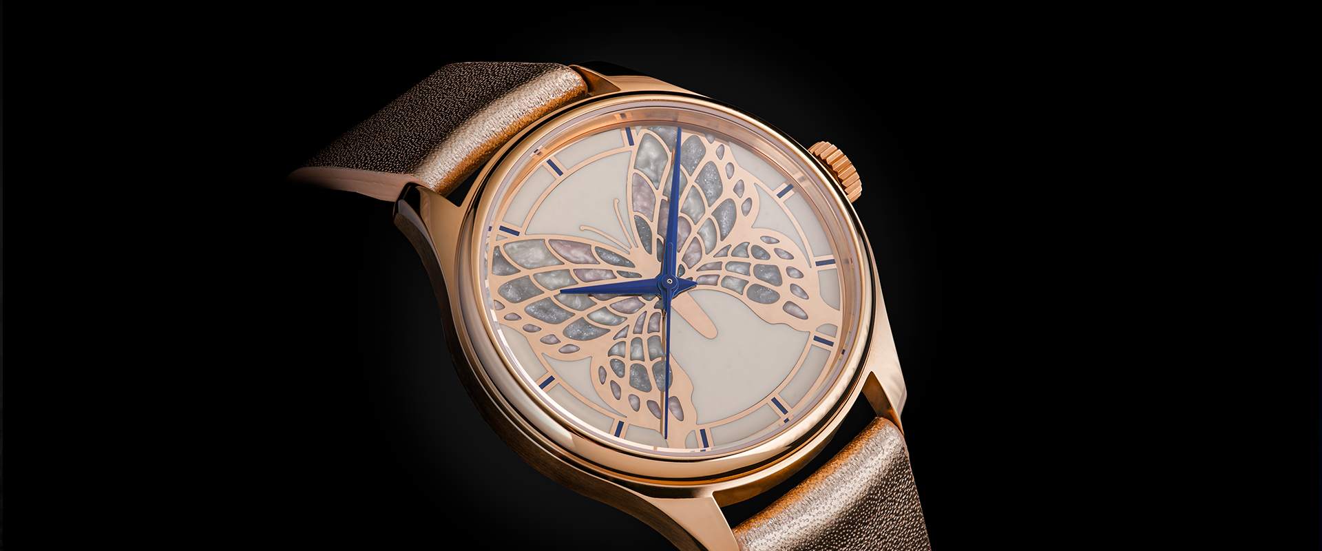 Jemnost a lehkost motýlích křídel přenesená do číselníku hodinek.