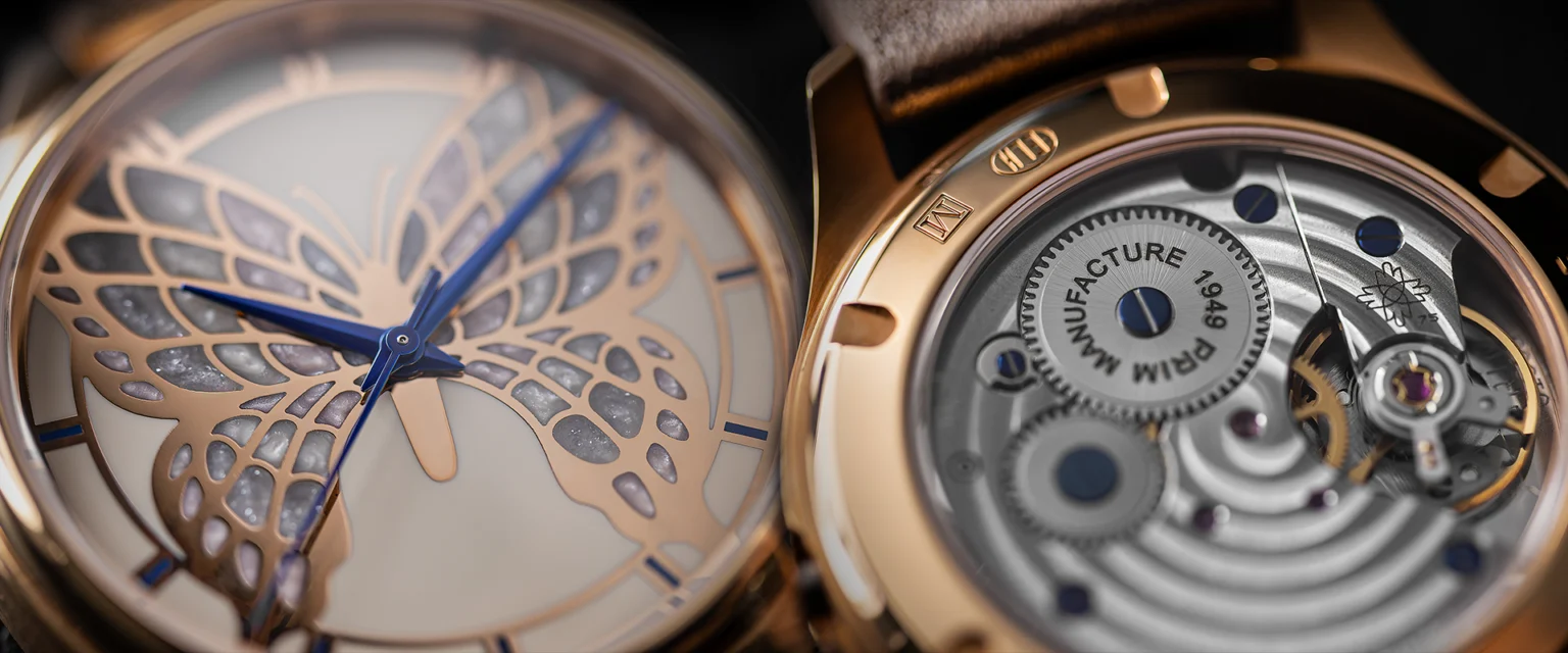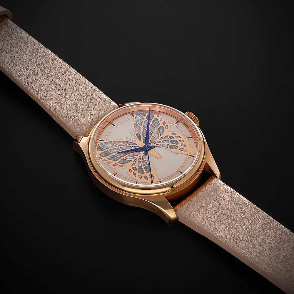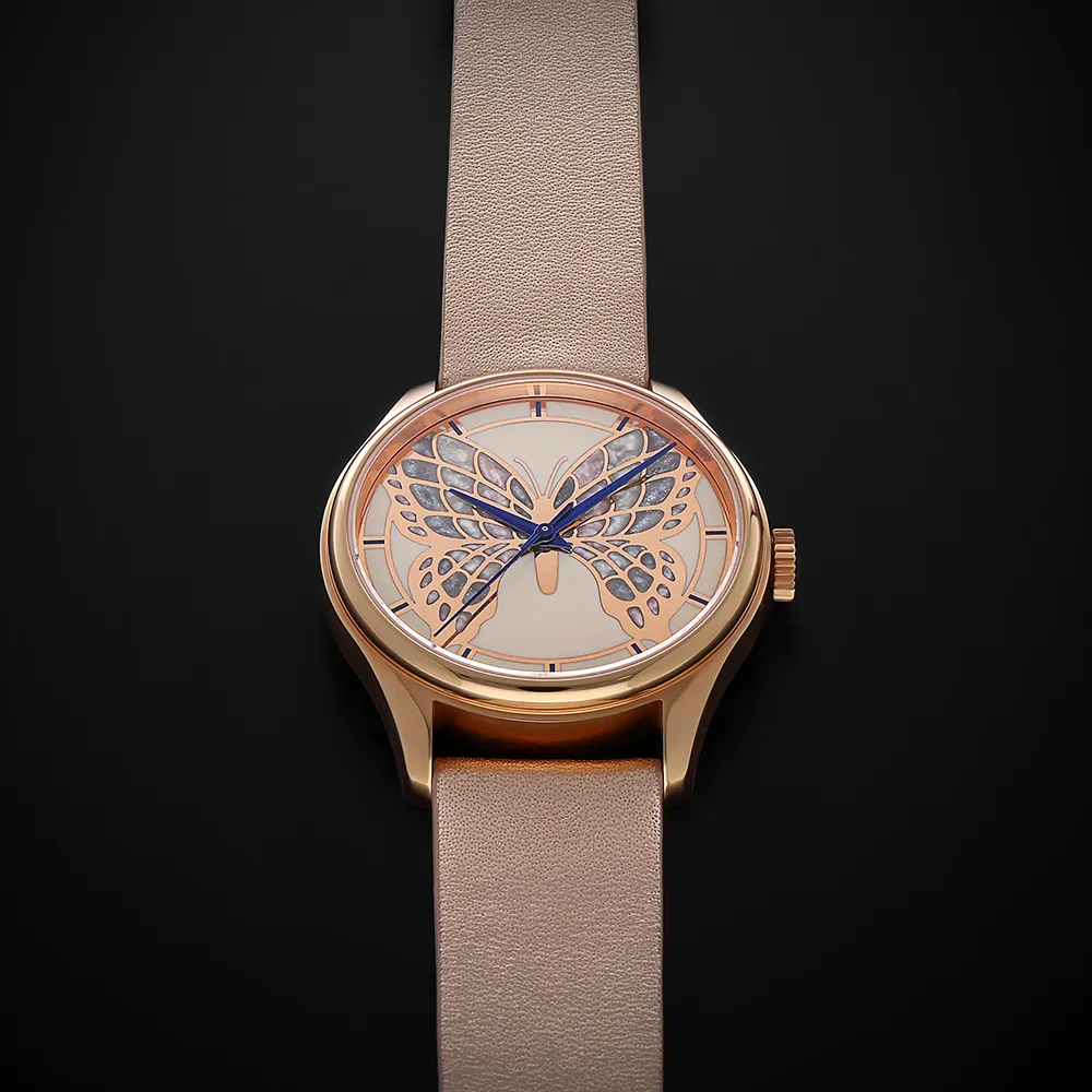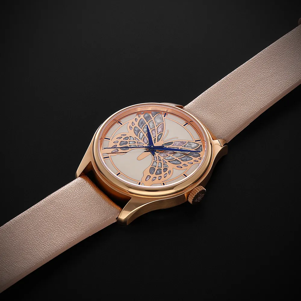 Jemnost a lehkost motýlích křídel přenesená do číselníku hodinek.