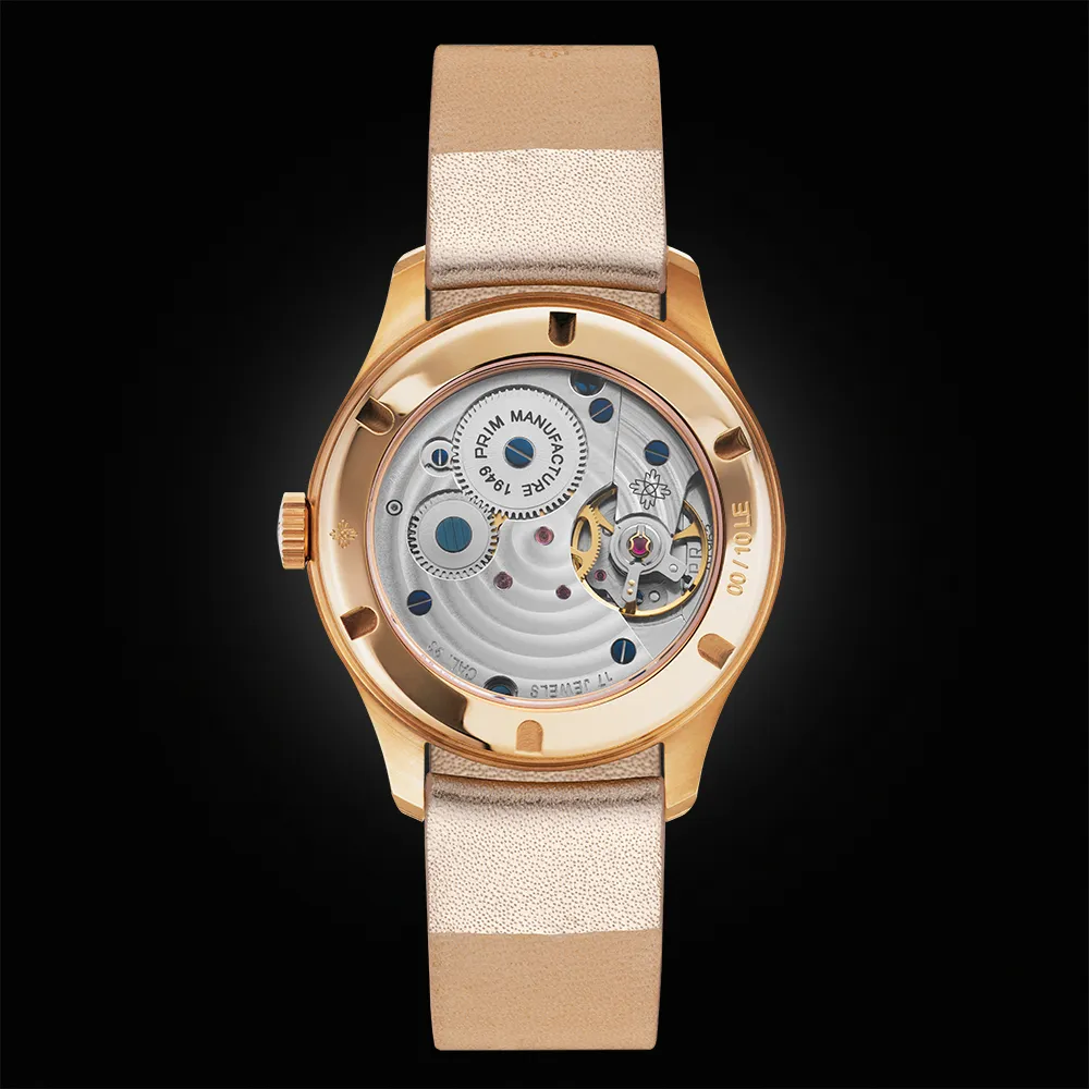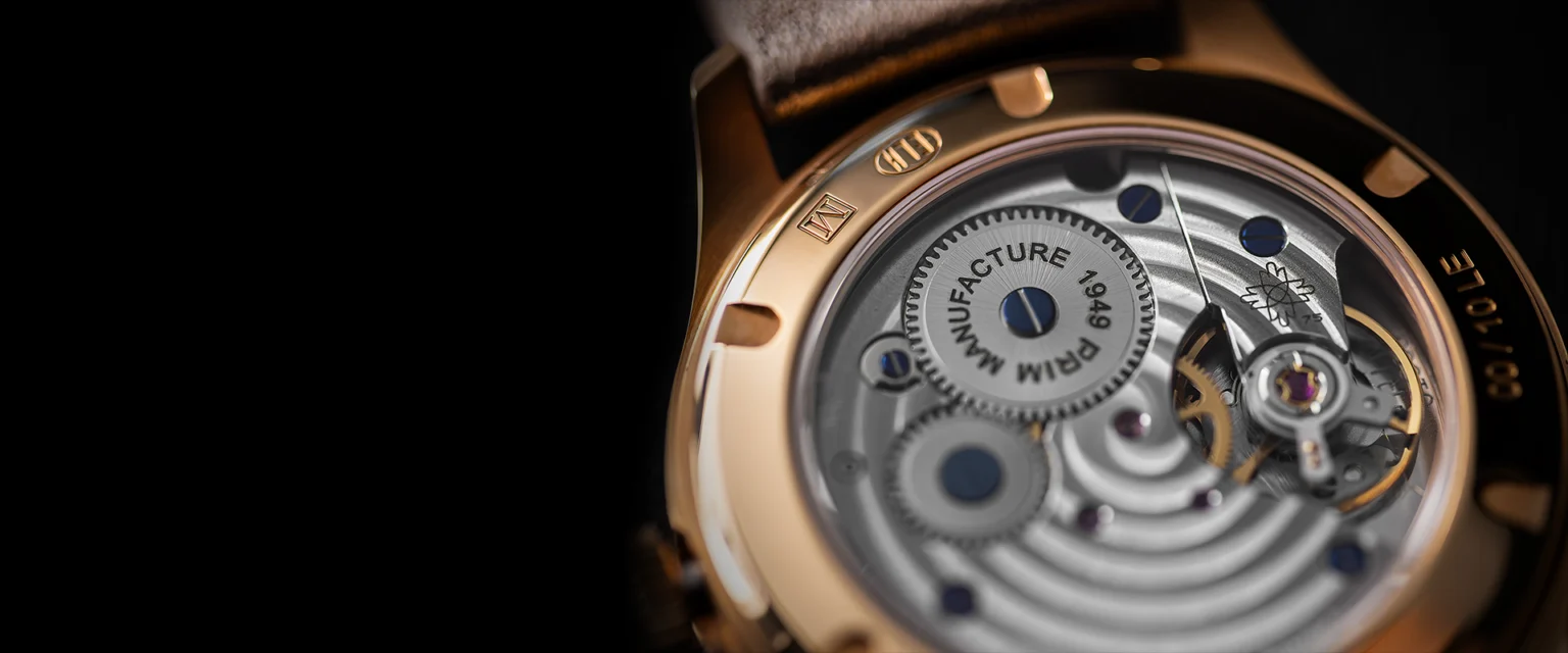 Uvnitř hodinek tiká to nejlepší, co česká výroba strojků nabízí. Přes prosklené zadní víko můžete sledovat fascinující práci inhouse mechanického strojku PRIM s ručním nátahem – ukázku dokonalé hodinářské práce.