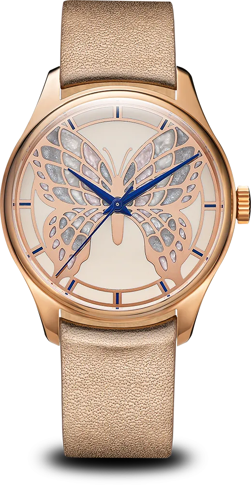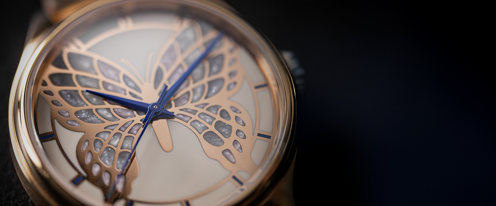 Exkluzivitu mistrovského hodinářského umění představuje zlacený číselník zdobený siluetou motýlích křídel, ručně vytvořenou technologií HyCeram®.