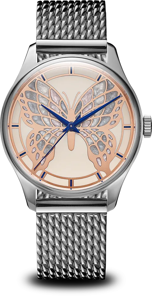 Je to velmi náročný proces, který vyžaduje až 24 hodin soustředěné práce. Spočívá v precizním nanášení jednotlivých barevných vrstev. Použití speciálního materiálu vytváří jemné perleťové odlesky, evokující povrch skutečných motýlích křídel. Harmonii barev doplňují modré ručky. Výsledkem je číselník, který se stává malým uměleckým dílem, podtrhující výjimečnost a jedinečnost každého kusu.