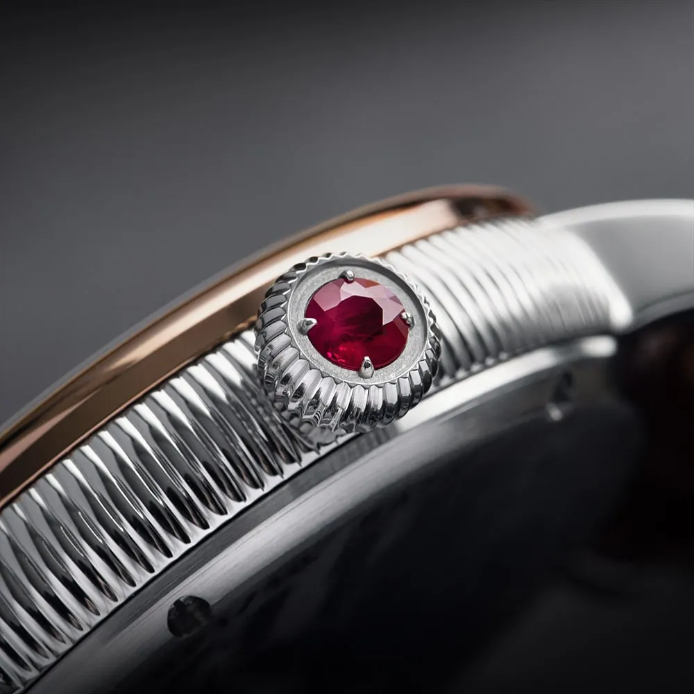 Celkem 5 barevných variant má následující společné prvky číselníku. Číslovky jsme vytvořili ve fontu typickém pro tehdejší dobu. Vše ještě doplňuje tulipánová korunka navržená designéry firmy, s 4 milimetrovým drahým kamenem na svém vrcholu. Zvolený drahokam, ať už diamant, rubín či safír, dotváří celý design hodinek.