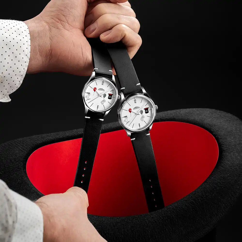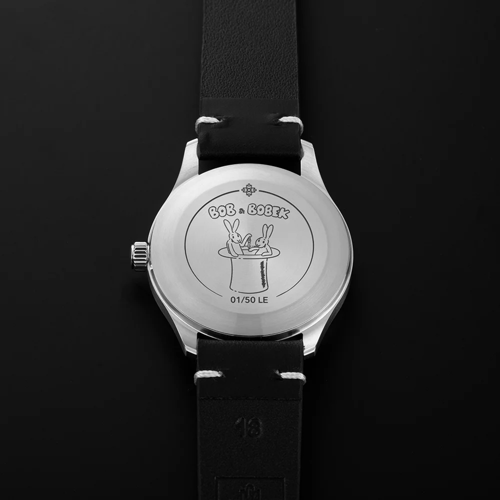 Víko hodinek nese veselou grafiku s vyobrazením Boba a Bobka, klobouku, hodinek a čísla v edici. Celý dojem vhodně doplňuje pečlivě vybraný kožený řemínek.