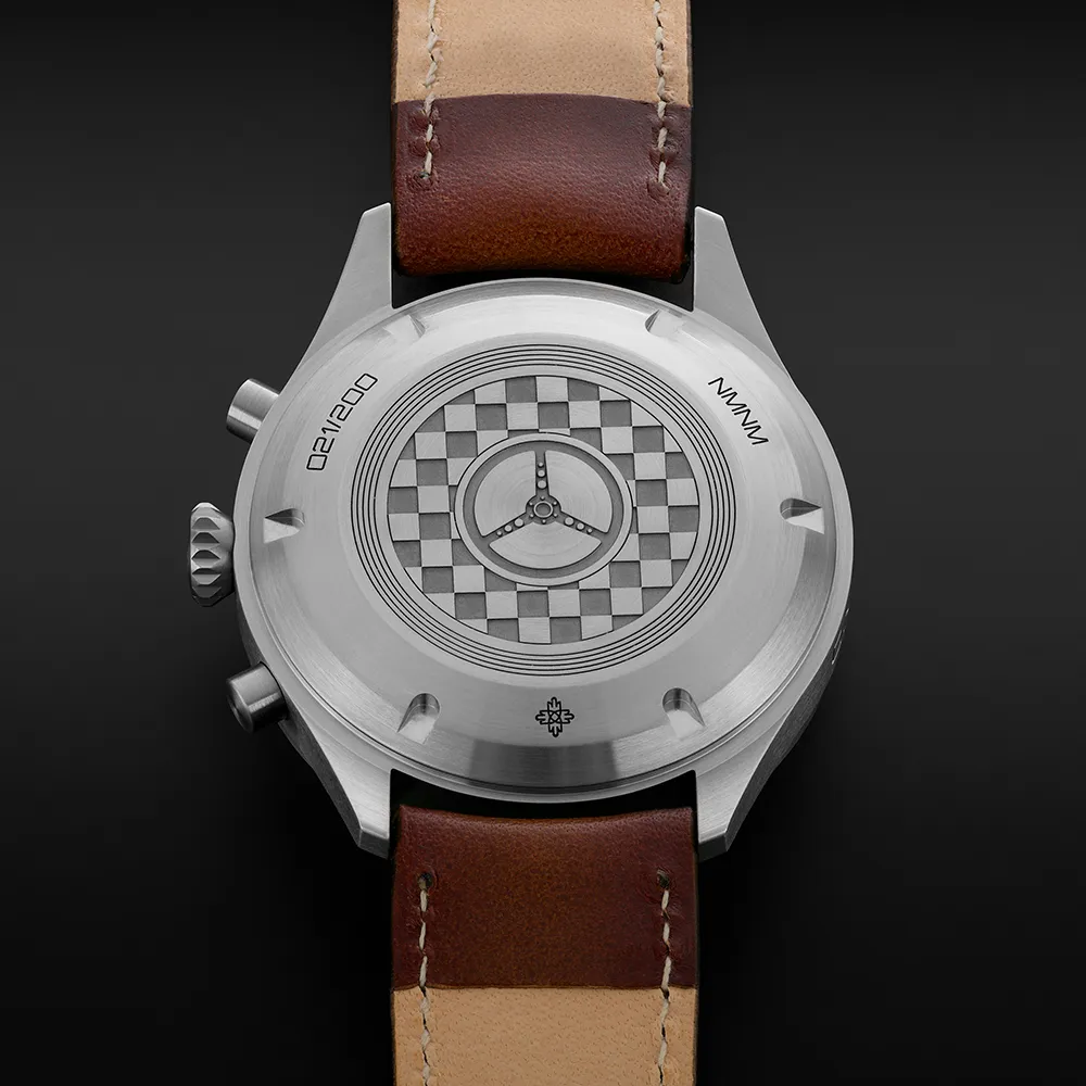 Tento model není jen o výkonu. Je to pocta estetice rychlosti. Kombinuje jemnost detailu s energií okamžiku. Laserem ryté víko a ručně patinovaný kožený řemínek evokují svými detaily svět automobilů, benzínu a svobody. Každý pohyb ručky na číselníku je jako otočka volantu, přesný a neodvolatelný.