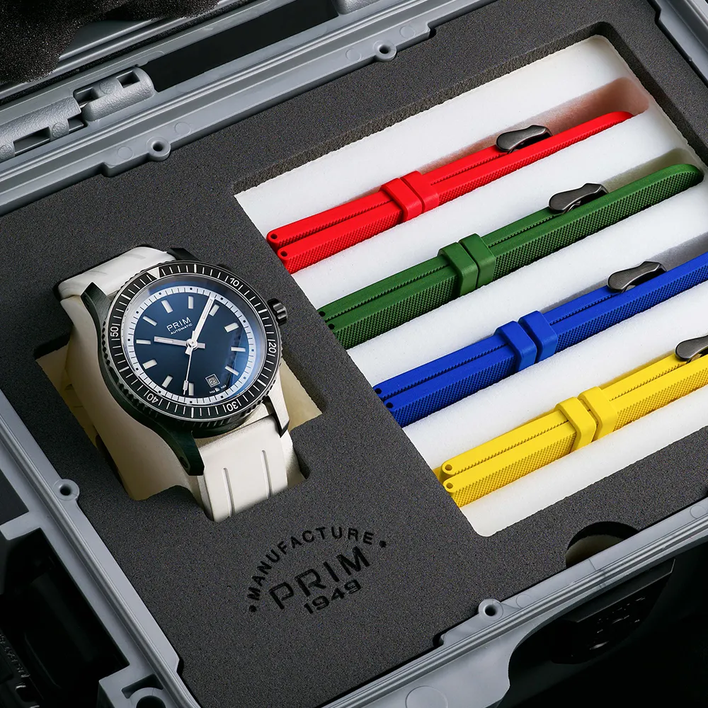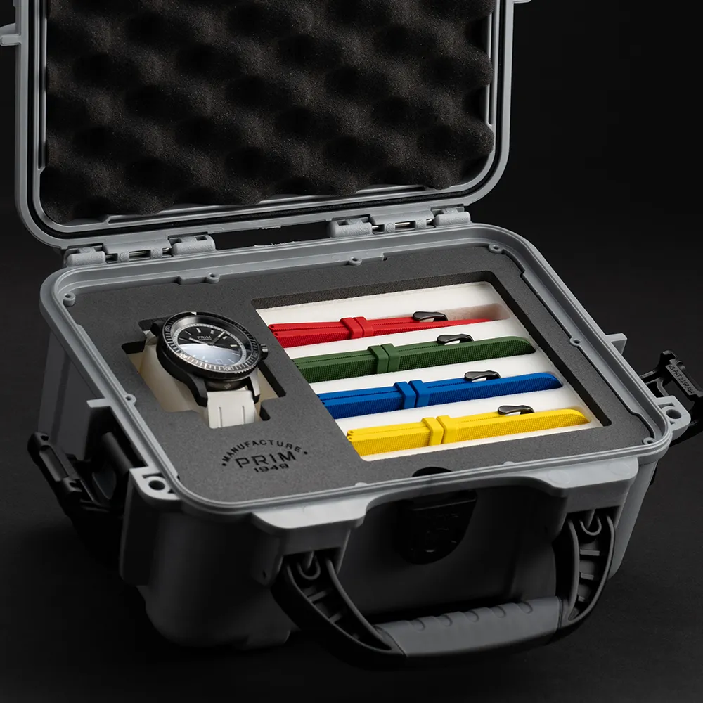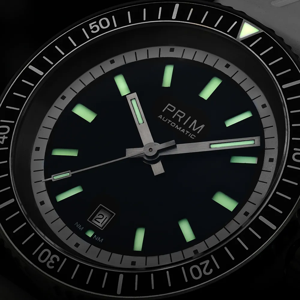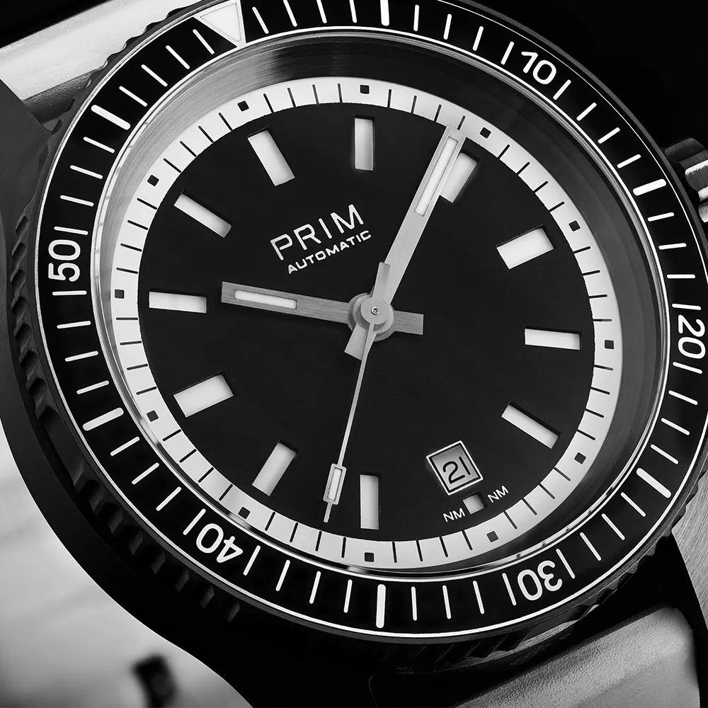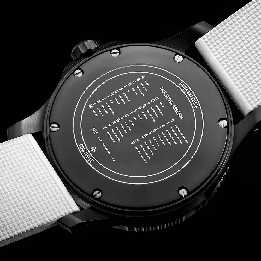 Číselník s luminiscenčními indexy respektuje původní vzhled legendárního modelu PRIM SPORT 2. Na zadním víku se ukrývá celá Morseova abeceda – malý kód pro ty, kteří rozumějí tichu.