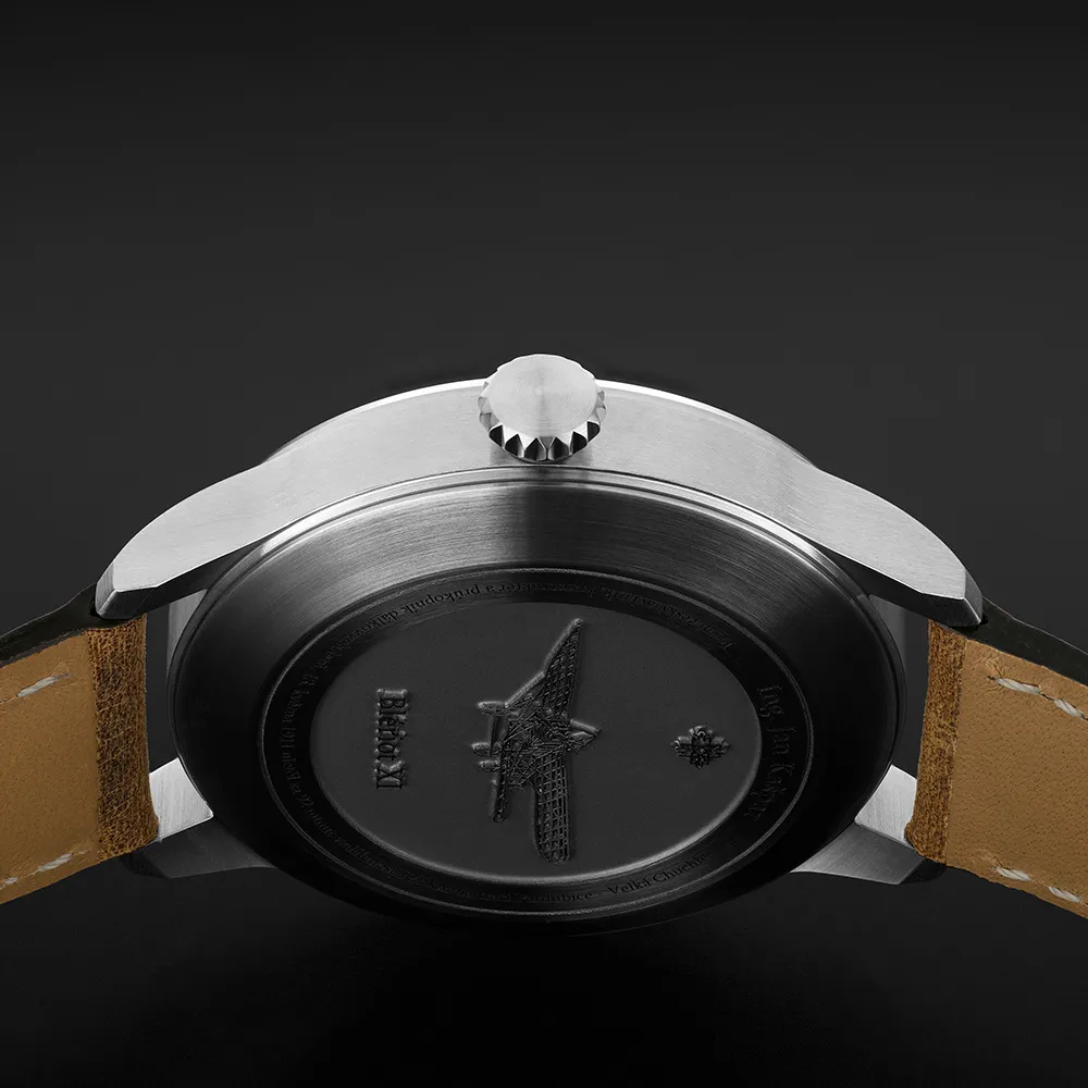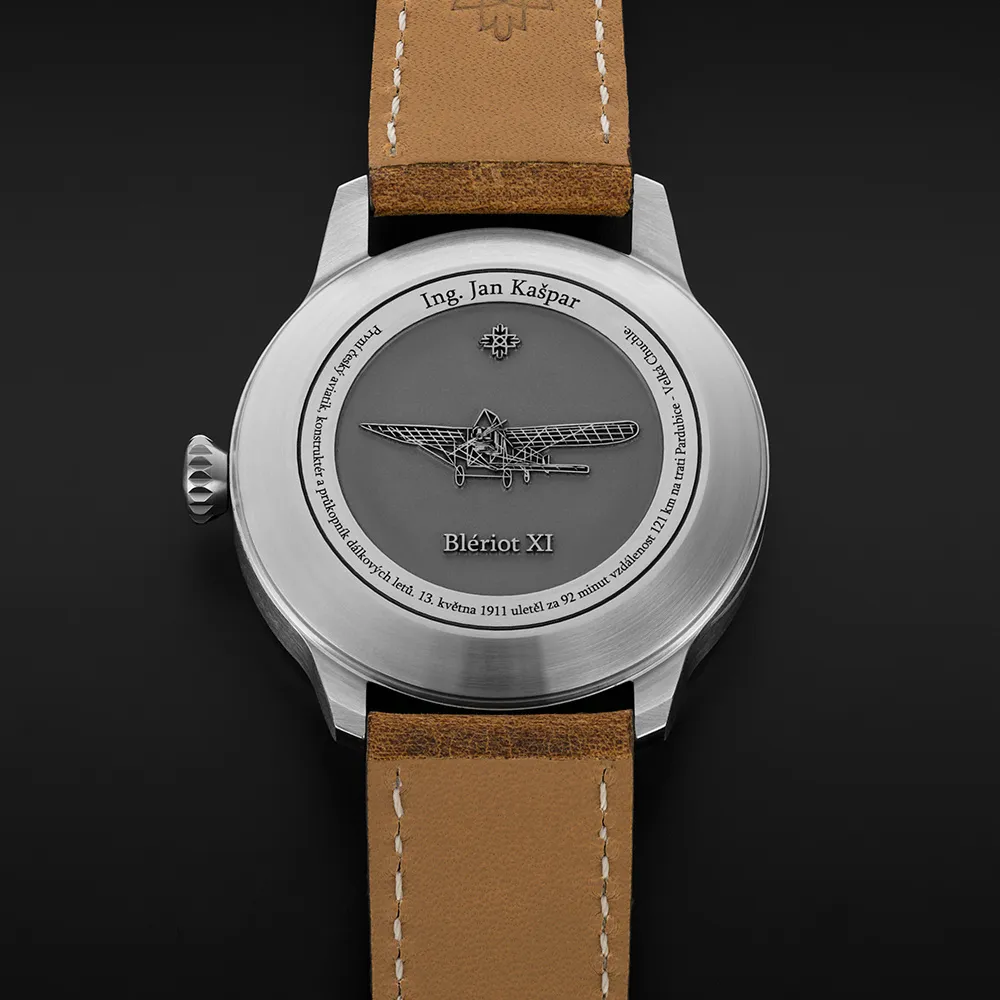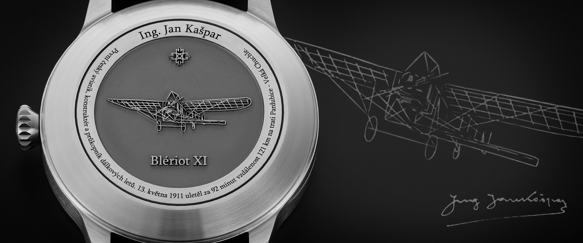 Víko hodinek zdobí silueta Kašparova stroje Blériot XI, bok pouzdra znázorňuje křivku a počet kilometrů letu z Pardubic do Velké Chuchle. Světlý, minimalisticky pojatý číselník, zdobí elegantní římské číslice a podpis Jana Kašpara. Hodinky jsou osazeny mechanickým strojkem ETA s automatickým nátahem od renomovaného švýcarského výrobce.