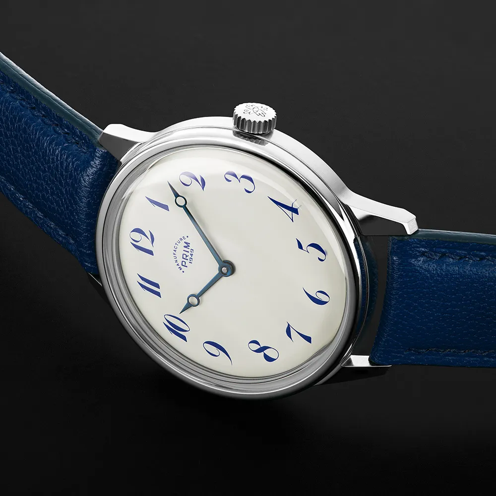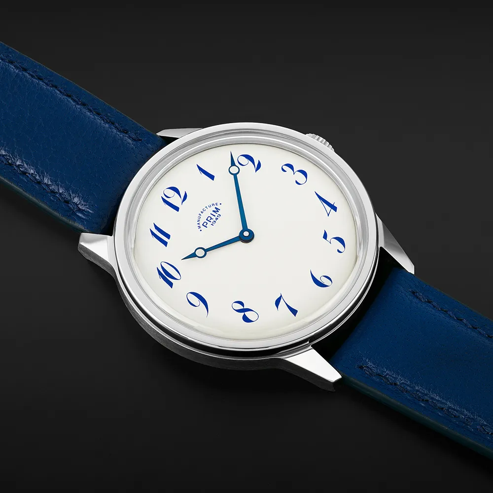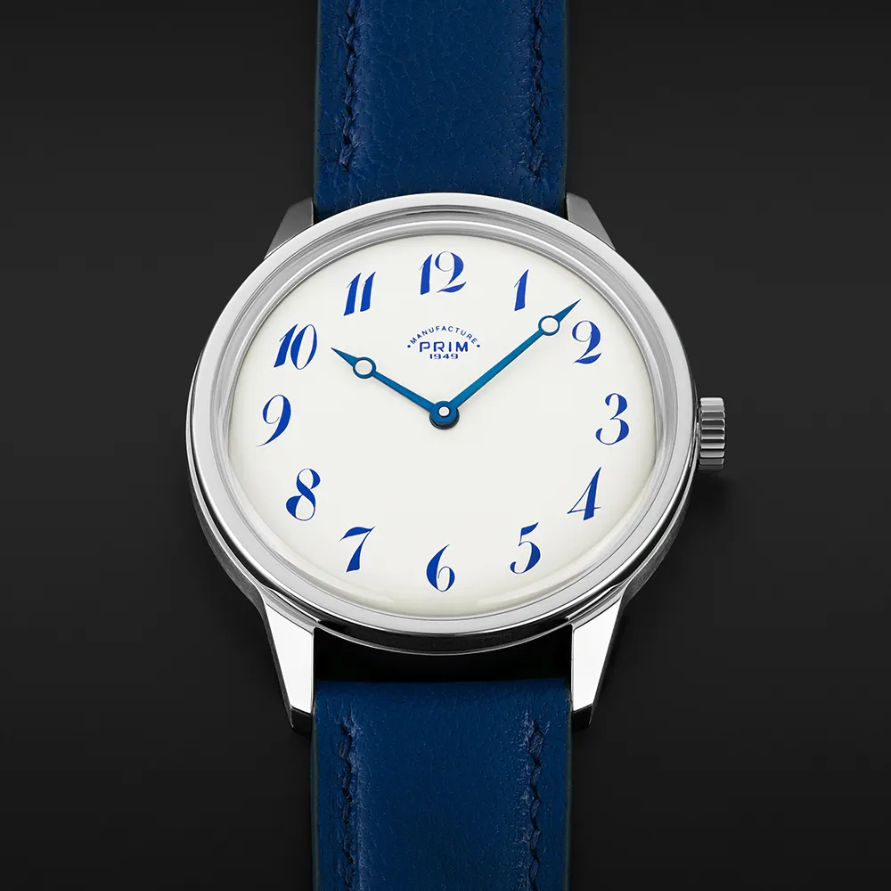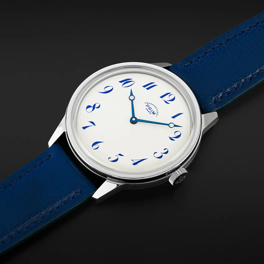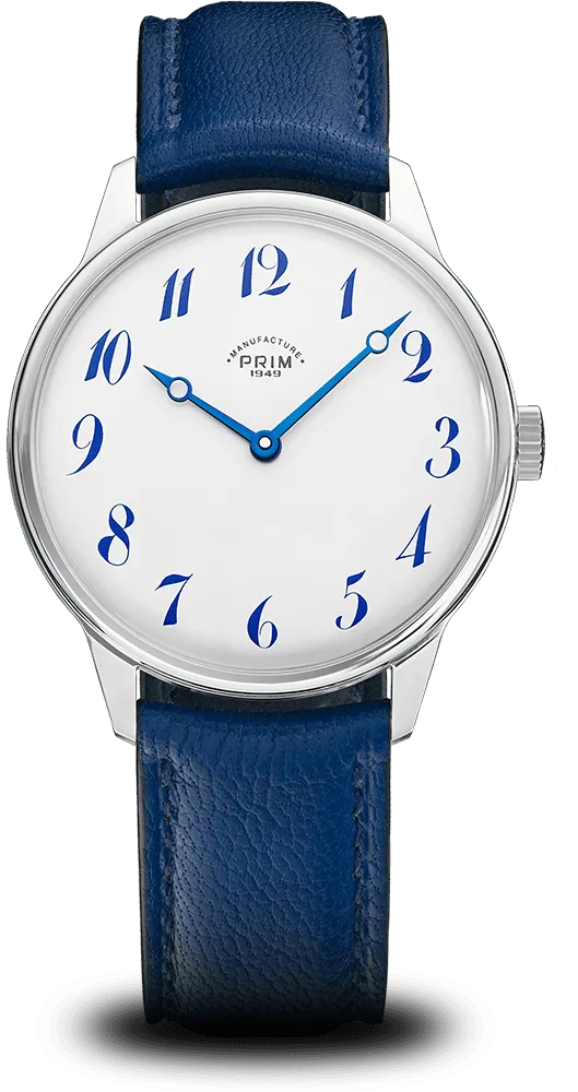 Hodinky nesou pečeť poctivé ruční práce i v dalších detailech. Ruční modření ruček je tradicí, kterou v PRIMu střeží jako posvátný plamen. Kožený řemínek s jemným modrým gradientem pak připomíná klid smetanovských tónů i hloubku večerní oblohy.