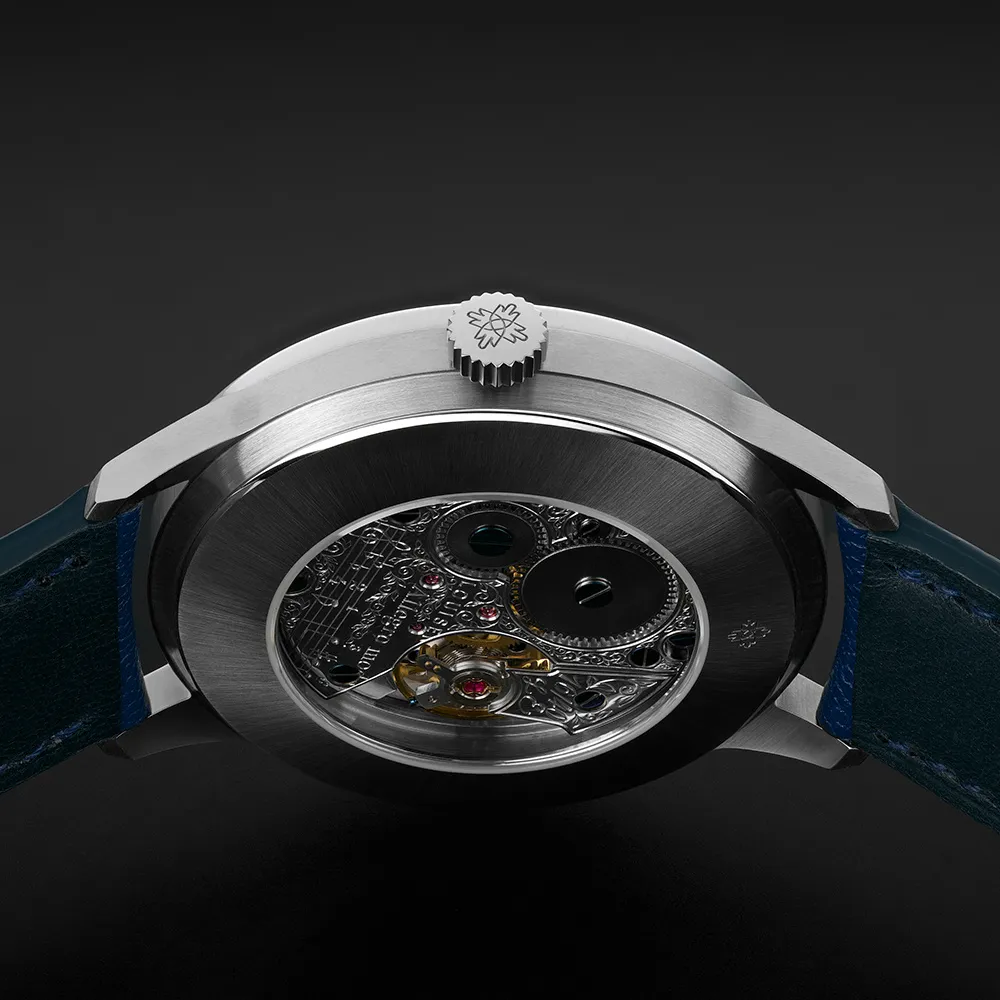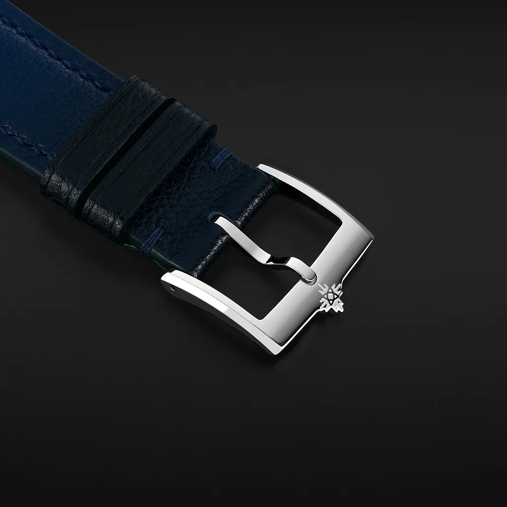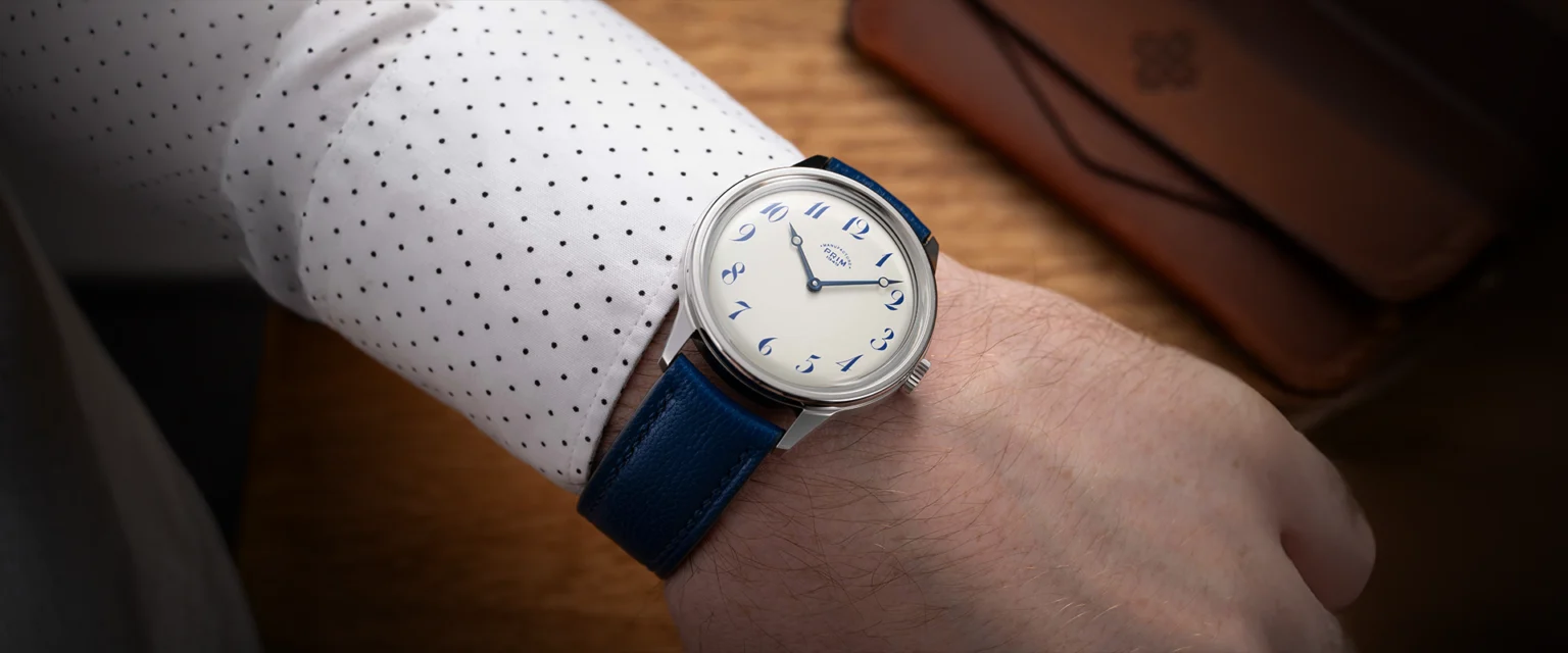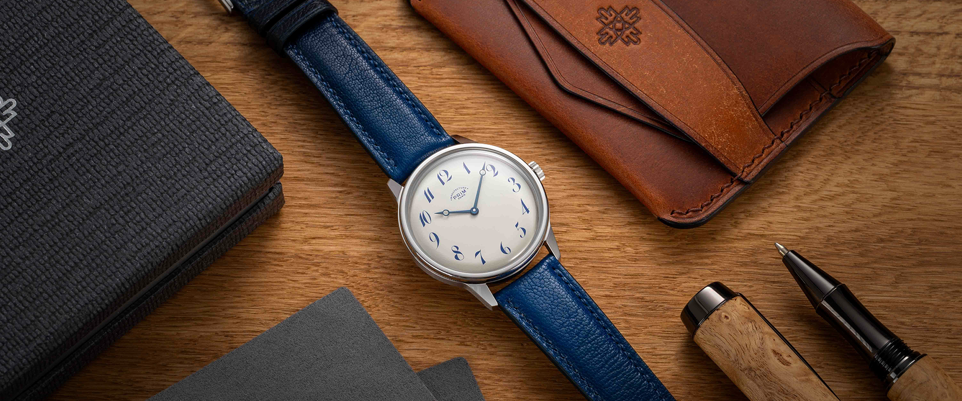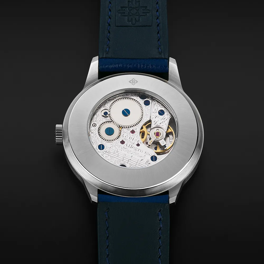 Hodinky nesou pečeť poctivé ruční práce i v dalších detailech. Ruční modření ruček je tradicí, kterou v PRIMu střeží jako posvátný plamen. Kožený řemínek s jemným modrým gradientem pak připomíná klid smetanovských tónů i hloubku večerní oblohy.