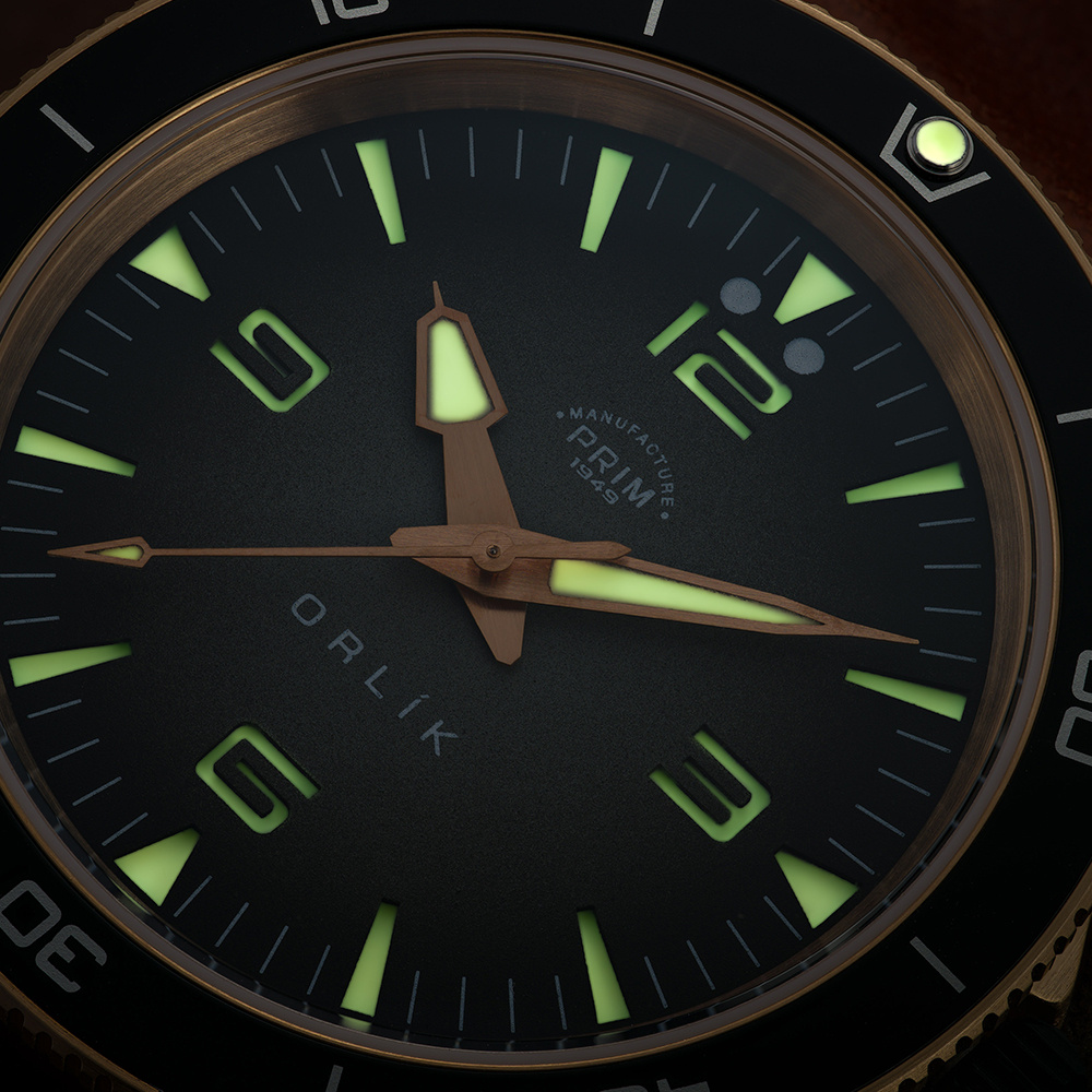 Barvy pro číselník a lunety byly pečlivě vybrány našimi designéry tak, aby souzněly s materiálem hodinek v jakékoliv fázi zabarvení pouzdra. Bok hodinek zdobí vyrytý symbol modelu Orlík.