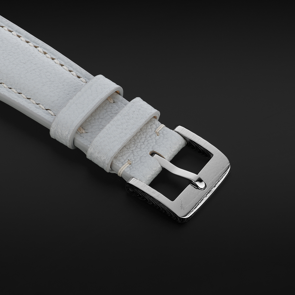 Na číselníku je v dolní části umístěn název modelu provedený v psacím fontu. Řemínek je šedý, barevně sladěný, z kvalitní hovězí kůže.