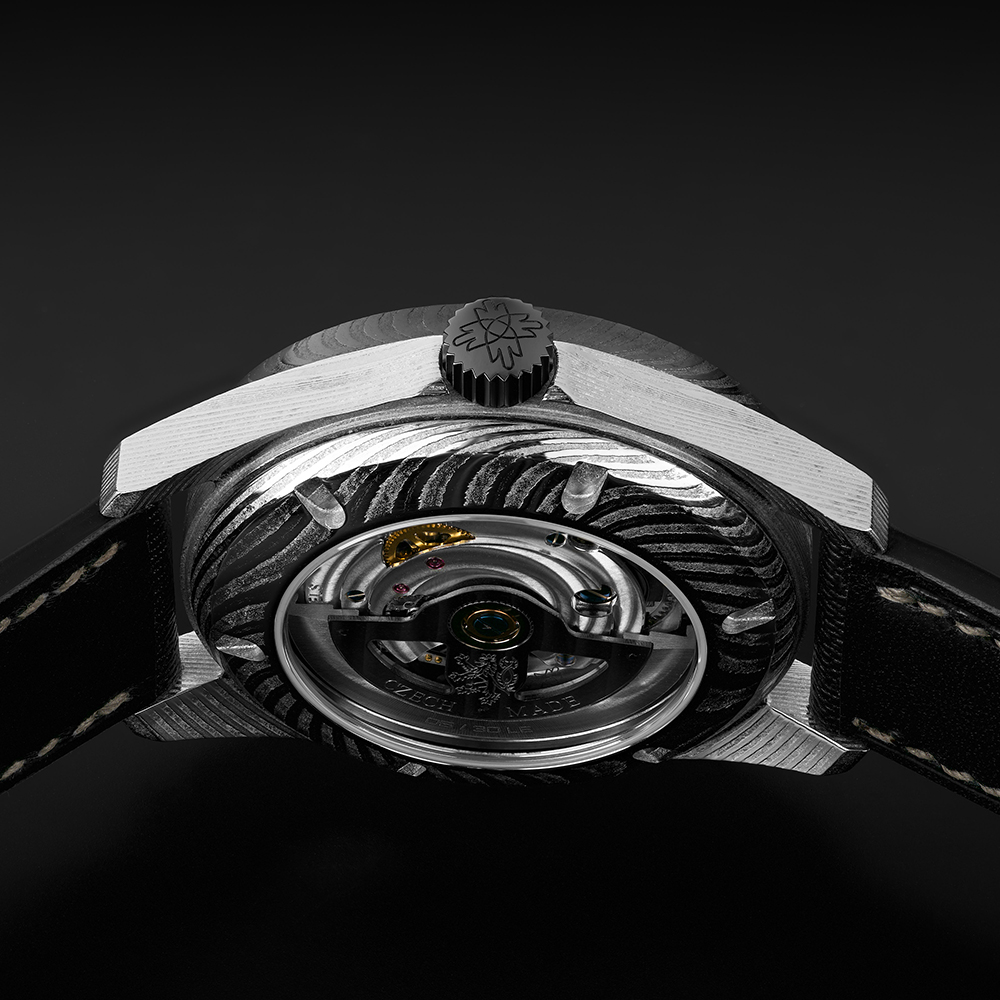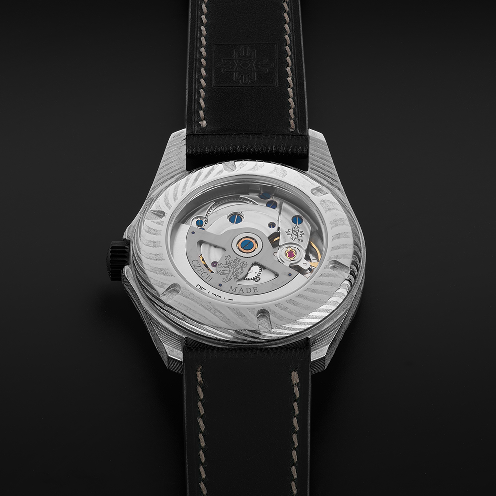 Hlavním a nápadným prvkem je samotný materiál pouzdra. Jde o neobyčejně zpracovaný damašek – Austenit. Ten kombinuje dvě austenitické – nekalitelné oceli. Obě složky vynikají nízkým obsahem niklu. Je hypoalergenní, vhodný pro kontakt s lidskou kůží. Společně pak tvoří podmanivý celek. Leptáním damašku se již při jeho výrobě zdůrazňuje zajímavá kresba. Leštění damaškových částí je precizní ruční práce trvající zkušenému zaměstnanci až 6 hodin. Ze stejného materiálu je také spona řemínku. Pouzdro samotné je navrženo s decentními hranami jako ochranou korunky. Ta je navíc, pro požadovanou odolnost, chráněna vrstvou DLC.
