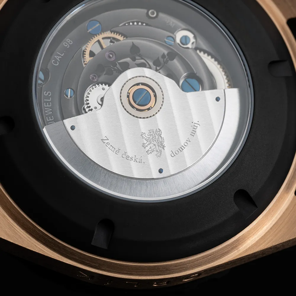 Bronzové pouzdro doplňuje kroužek v lunetě, který zdobí nápis Pravda vítězí. První kvadrant číselníku zvýrazňuje minutáž v barvě trikolory. Zadní víko s průhledem na strojek odkrývá detaily malé provedením, avšak velké svým významem. Na rotoru najdete slova naší hymny „Země česká, domov můj“ spolu s českým lvem. Na strojku nechybí lipová ratolest, jako odkaz na tradiční český národní strom a také symbol novoměstské manufaktury PRIM–piktogram.