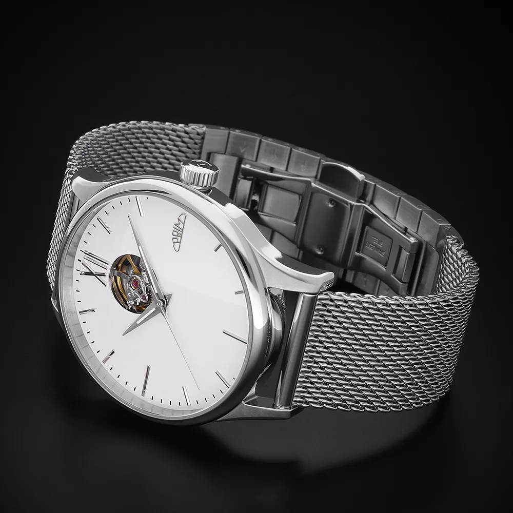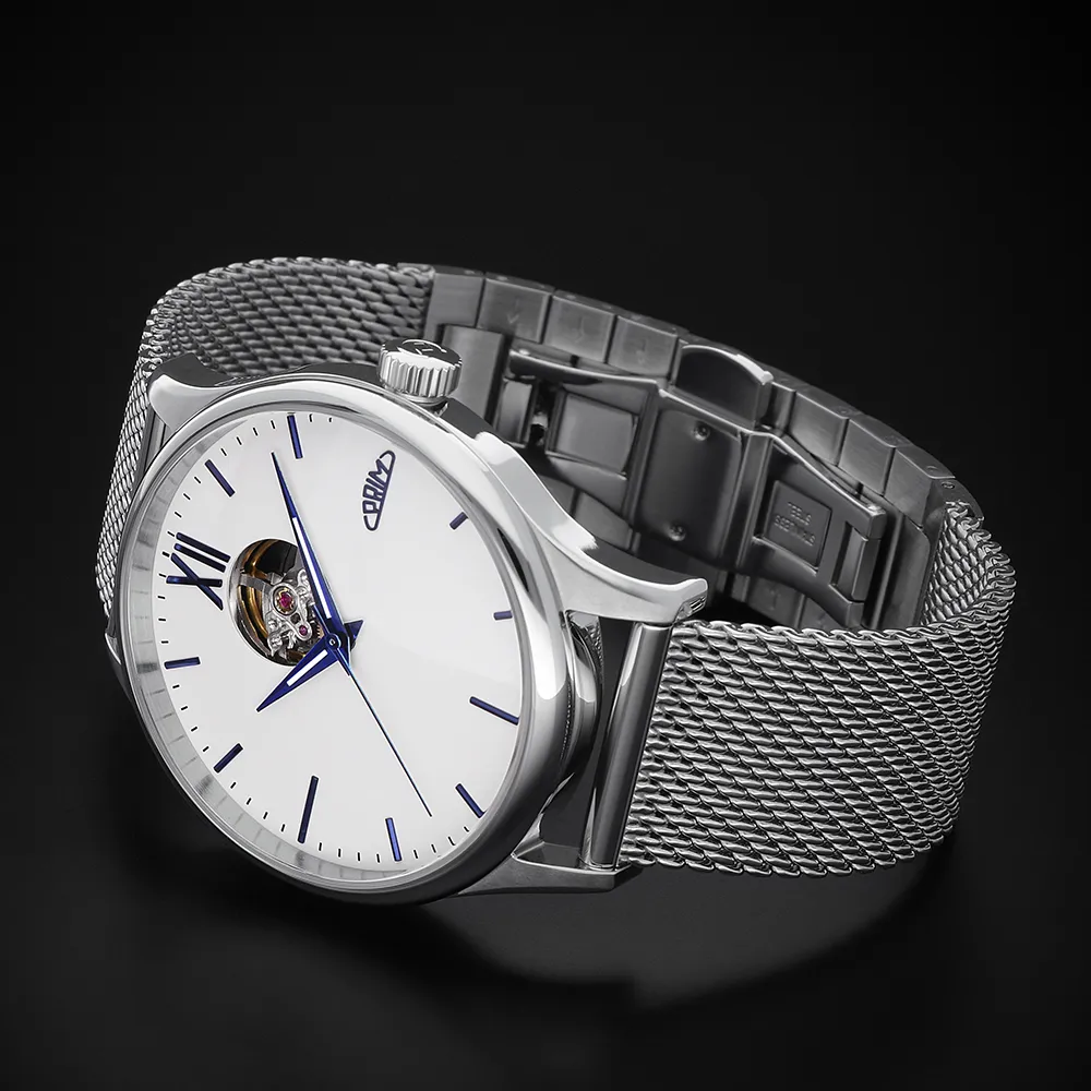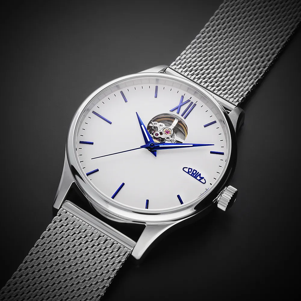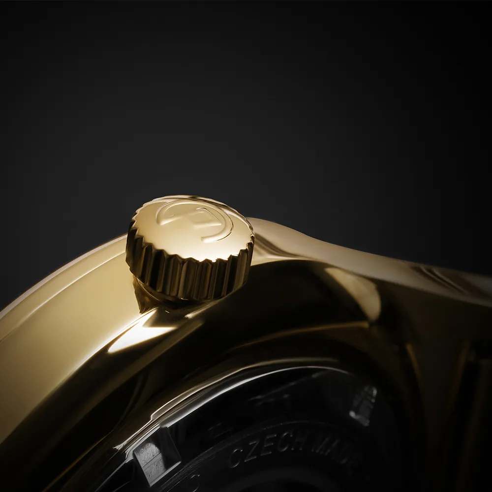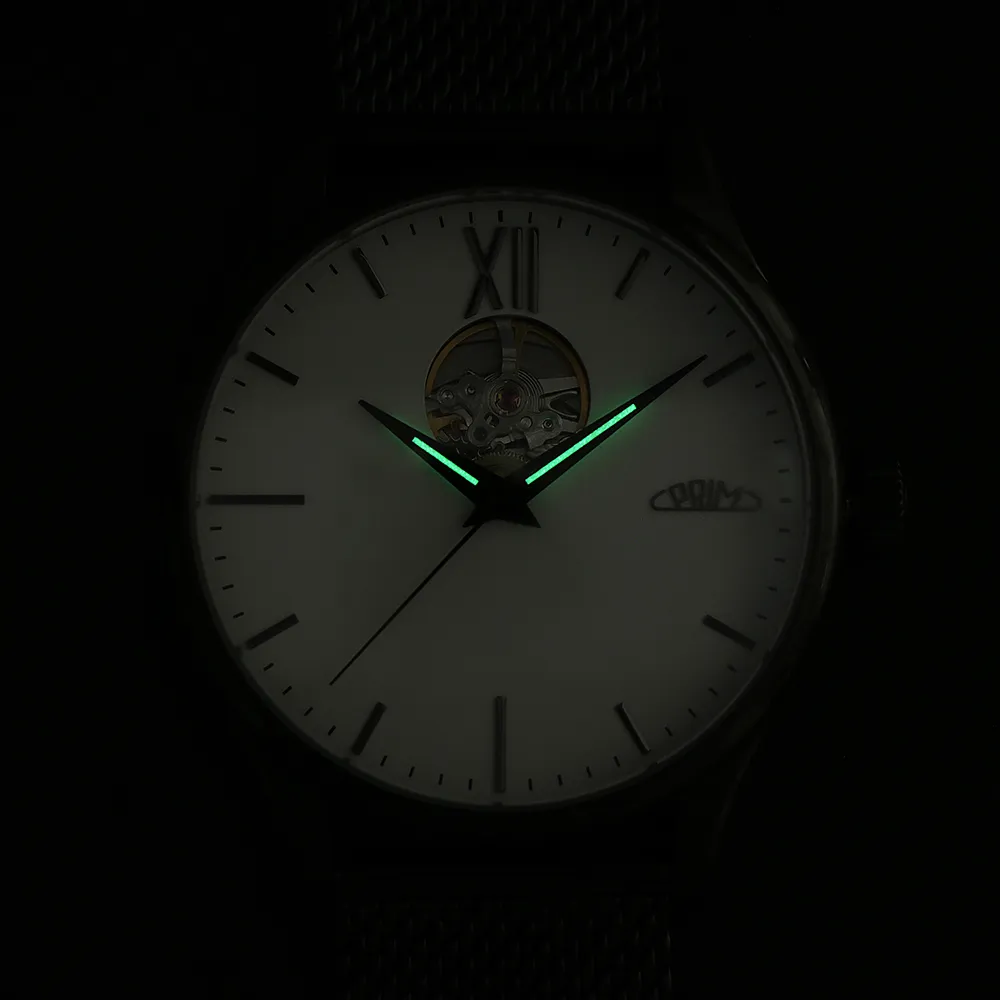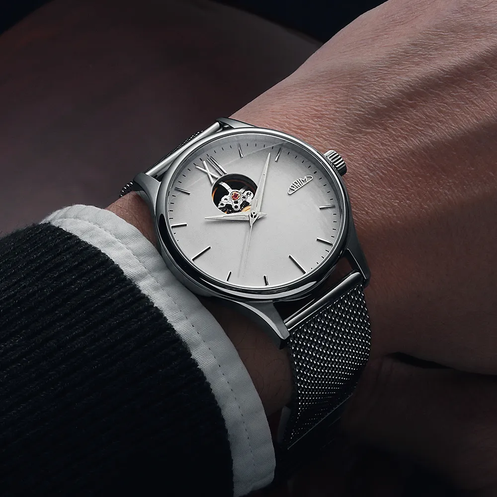 Pánové ocení elegantní, minimalistický číselník s moderními ručně usazovanými indexy doplněné dominantní římskou XII. K modelu jsme zvolili populární Dauphine ručičky s jemnou luminiscencí, které doplňují celkový společenský vzhled. Logo PRIM je netradičně umístěné na pozici 3 hod. Korunka je detailně promyšlená a zdobí ji decentní logo – ikona písmene P přecházející do kruhového oblouku, který představuje plynutí času.