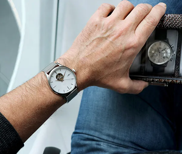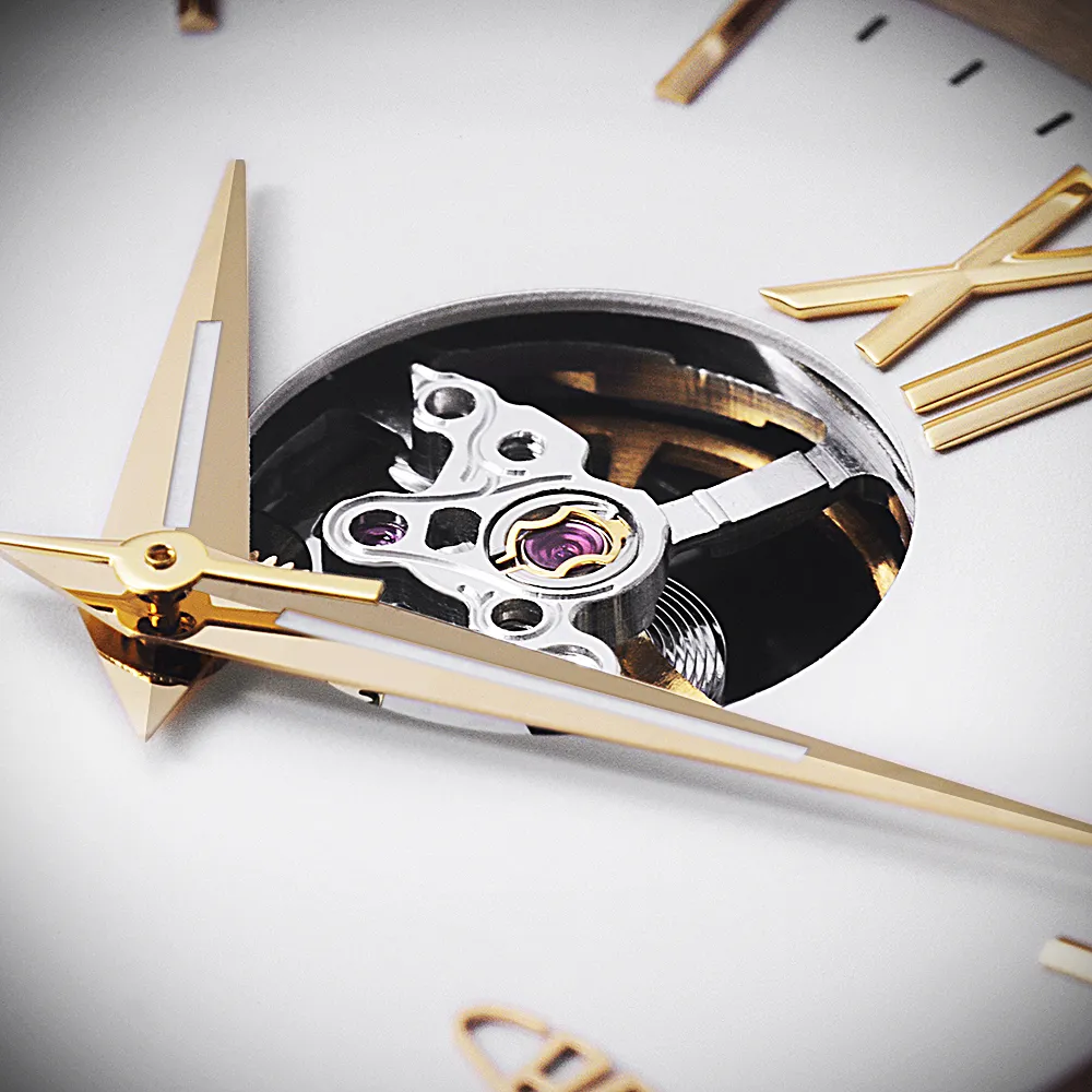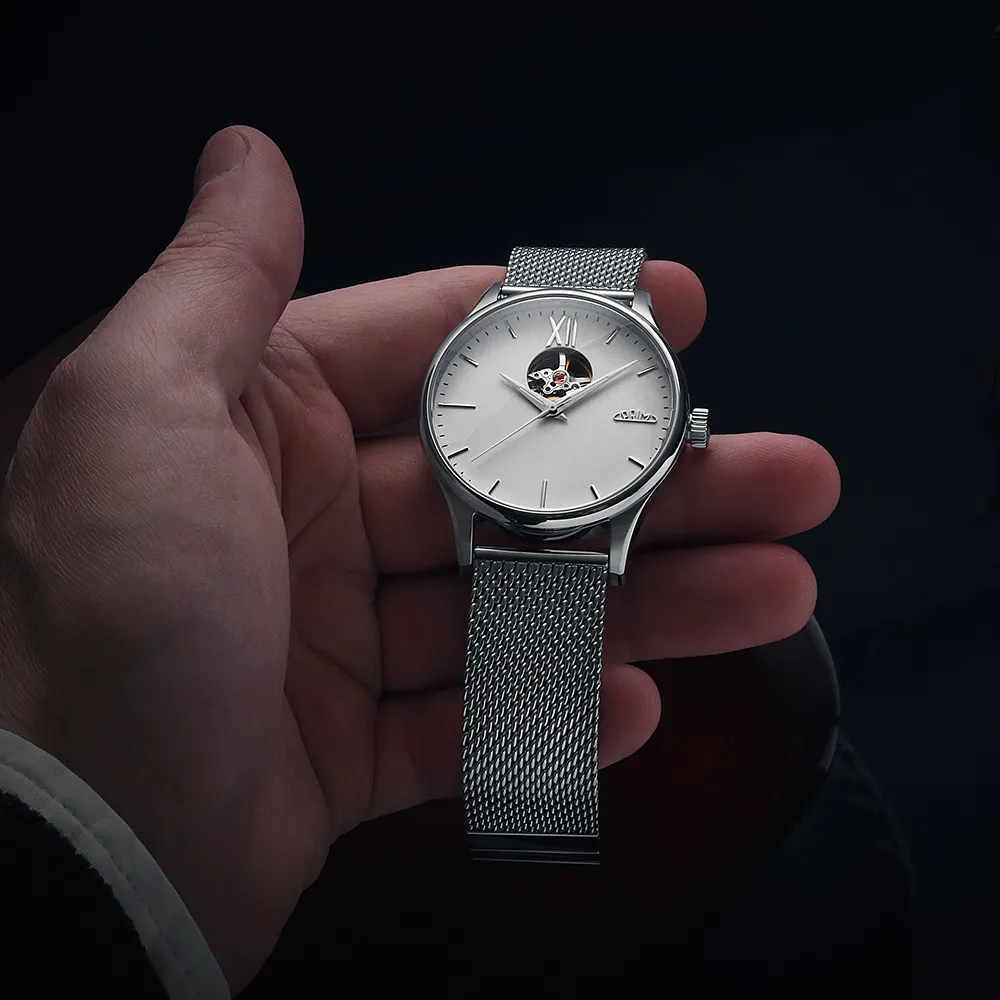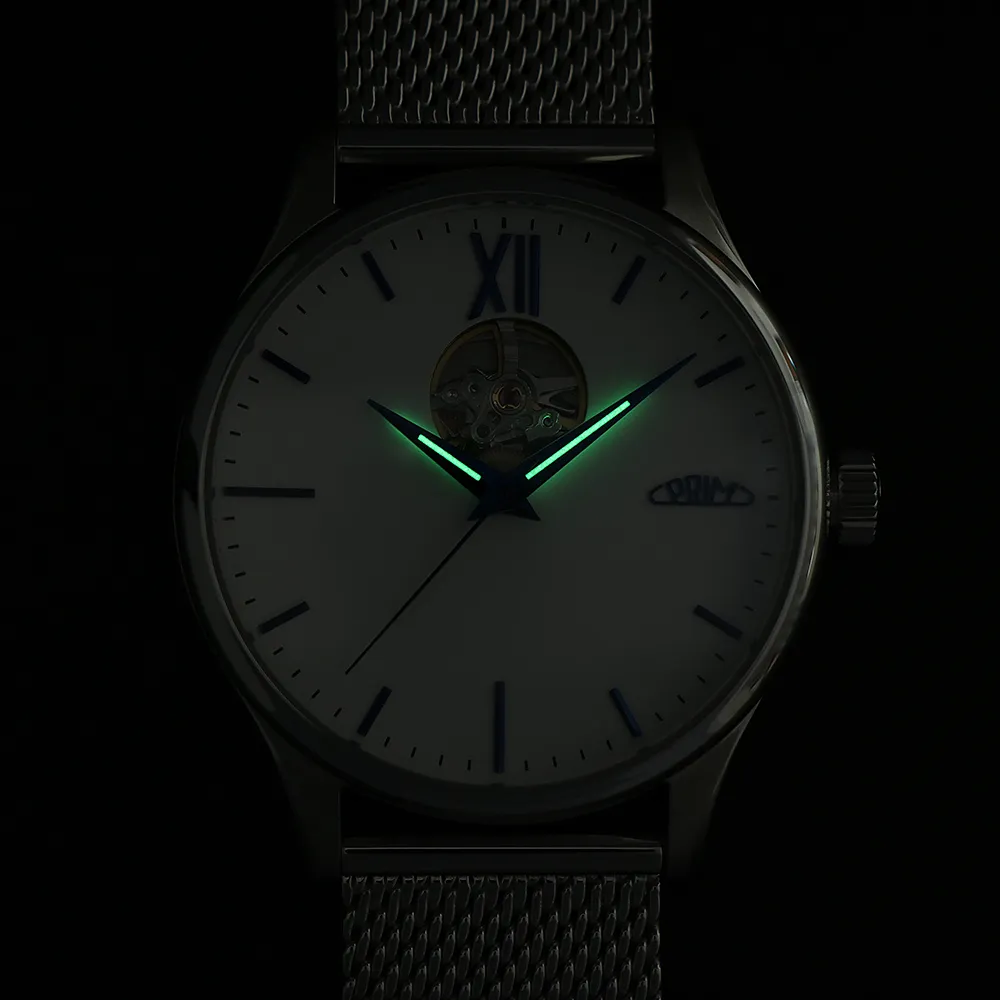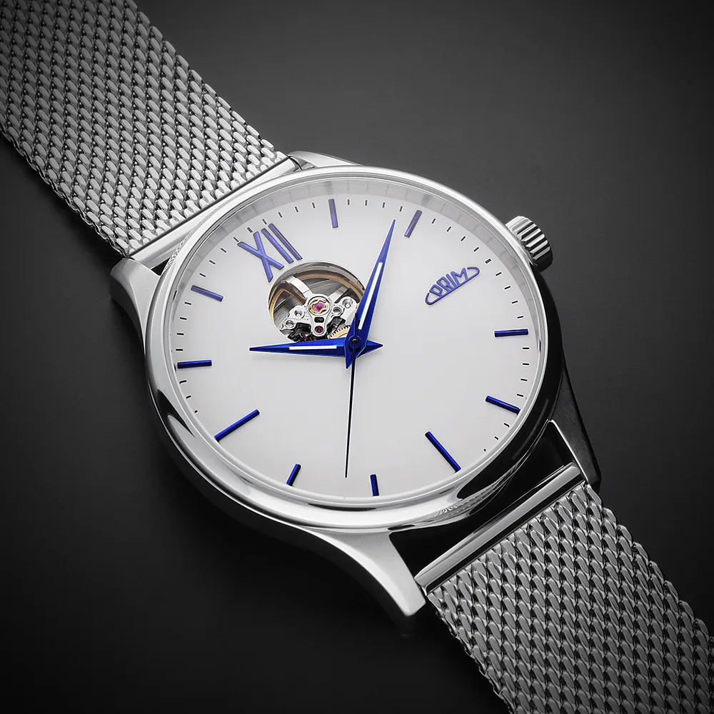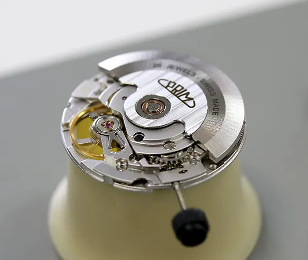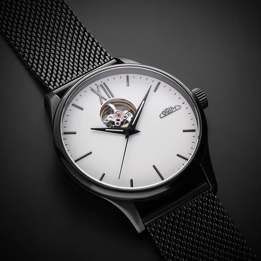 Pánové ocení elegantní, minimalistický číselník s moderními ručně usazovanými indexy doplněné dominantní římskou XII. K modelu jsme zvolili populární Dauphine ručičky s jemnou luminiscencí, které doplňují celkový společenský vzhled. Logo PRIM je netradičně umístěné na pozici 3 hod. Korunka je detailně promyšlená a zdobí ji decentní logo – ikona písmene P přecházející do kruhového oblouku, který představuje plynutí času.