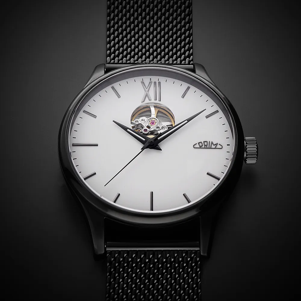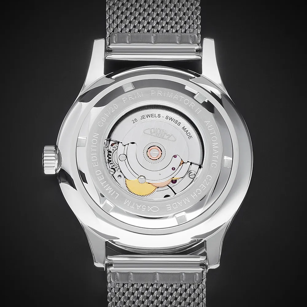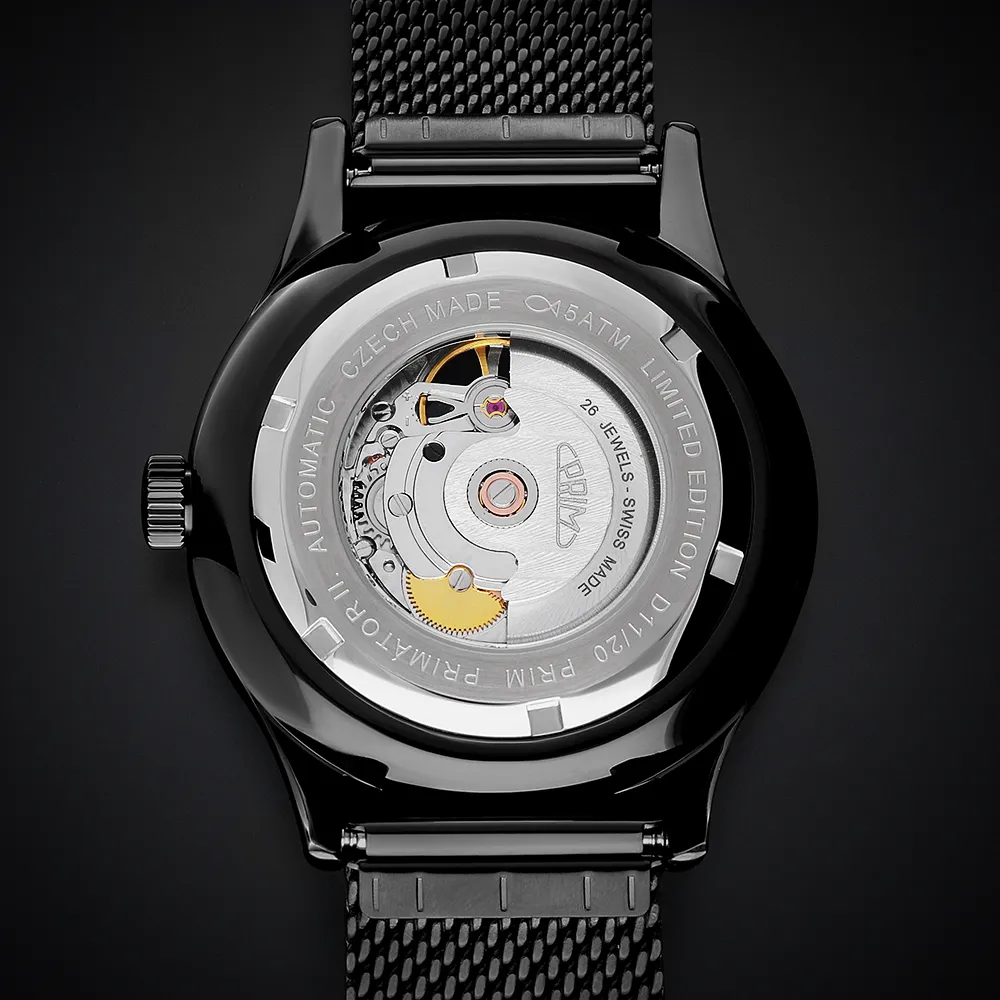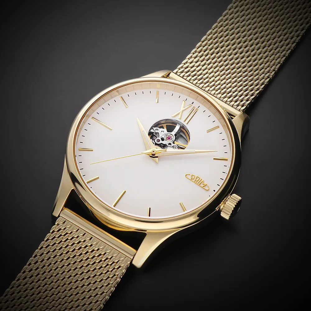 Pánské luxusní hodinky PRIM Automatic Primátor v speciální sérii 70 kusů. Exkluzivní hodinky inspirované klasickým a moderním designem s netradičním průzorem v horní části číselníku. Náš grafický tým se nechal inspirovat čistým minimalistickým designem. Připravili jsme pro Vás tento model ve 3 moderních barevných kombinacích – zlatá, stříbrná a černá. Edice stvořená pro opravdové gentlemany.