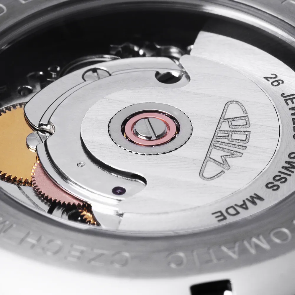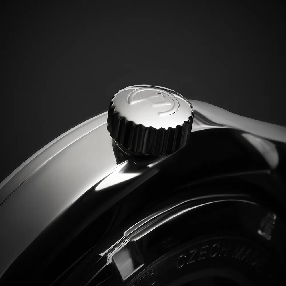Výjimečné retro mechanické hodinky s automatickým natahováním. Pouzdro je vyrobeno z ušlechtilé nerezové oceli 316L, vyleštěné do vysokého lesku. Do pouzdra hodinek je vsazen kalibr STP5-15 s 26 kameny vyrobený na zakázku pro naši společnost od švýcarského výrobce.