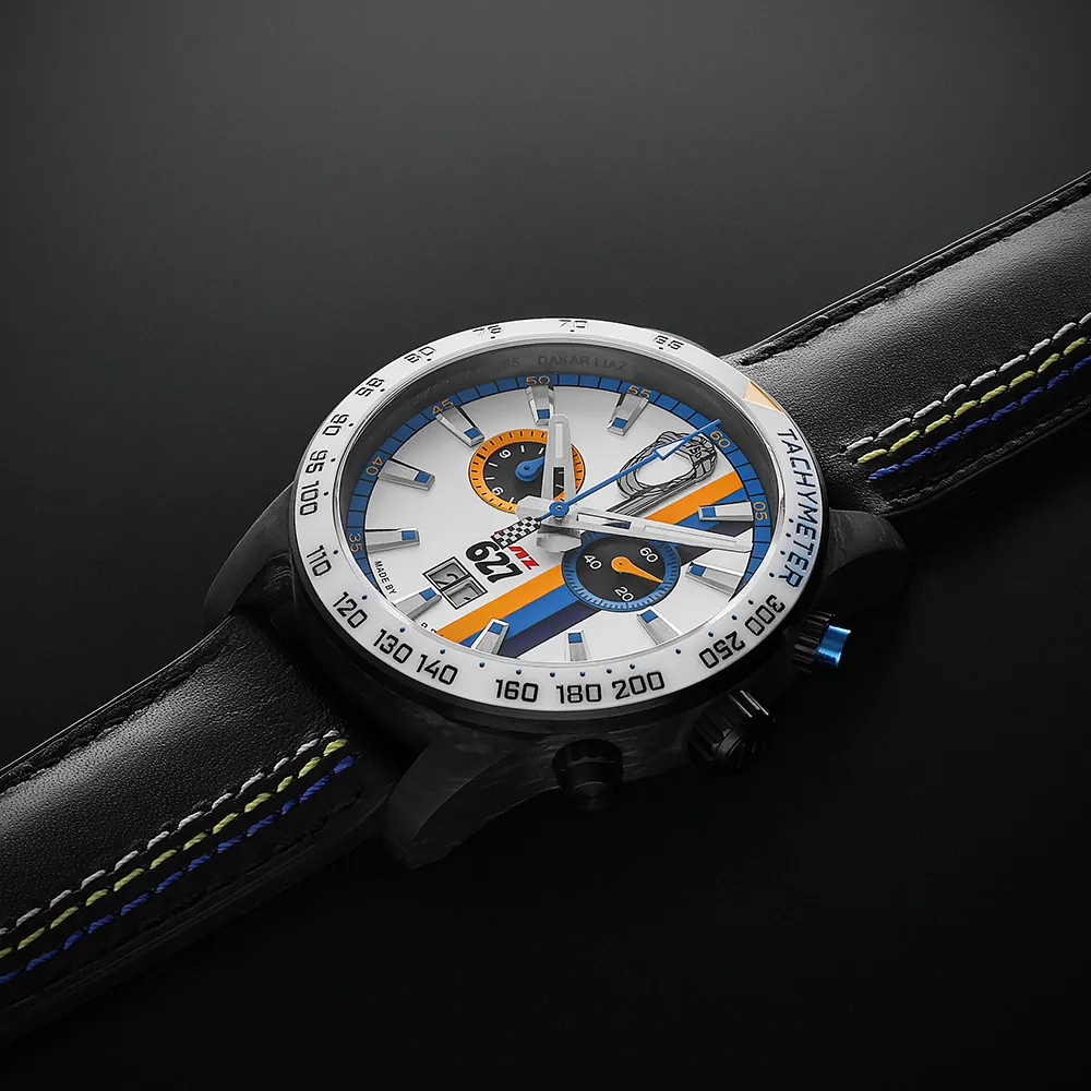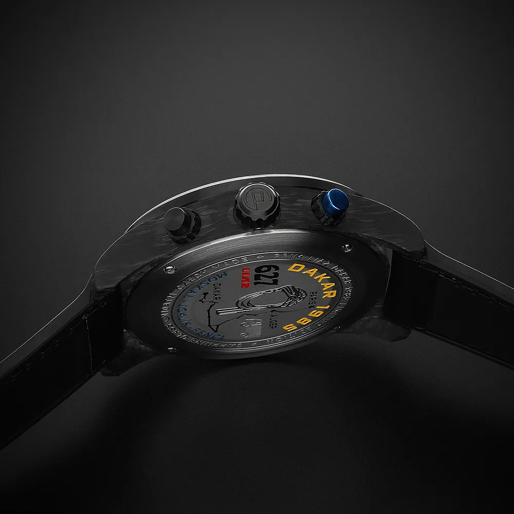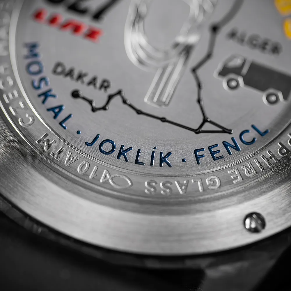 Celý vzhľad podčiarkuje biela keramická luneta tachymetra, ladená do tradičných farieb LIAZ. Jemným detailom je aj rytina Dakar LIAZ na vnútornej strane puzdra.