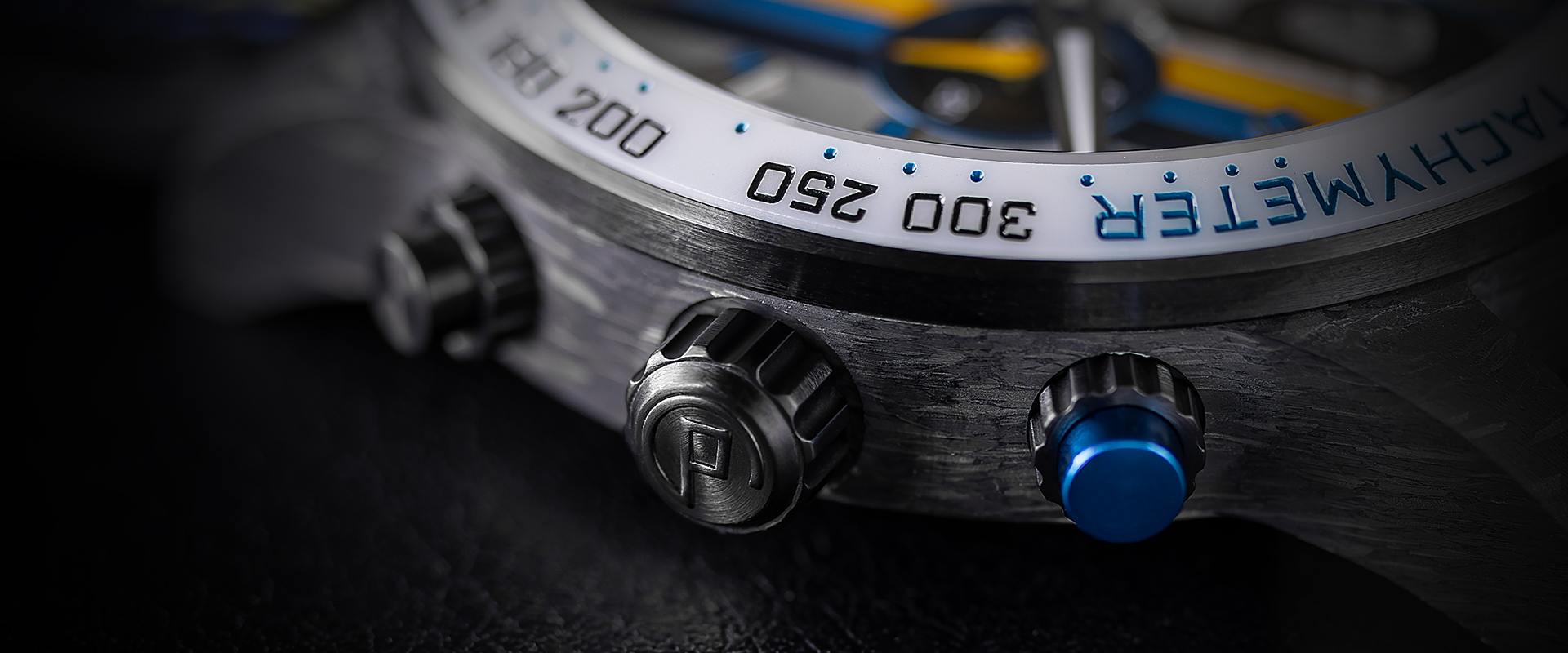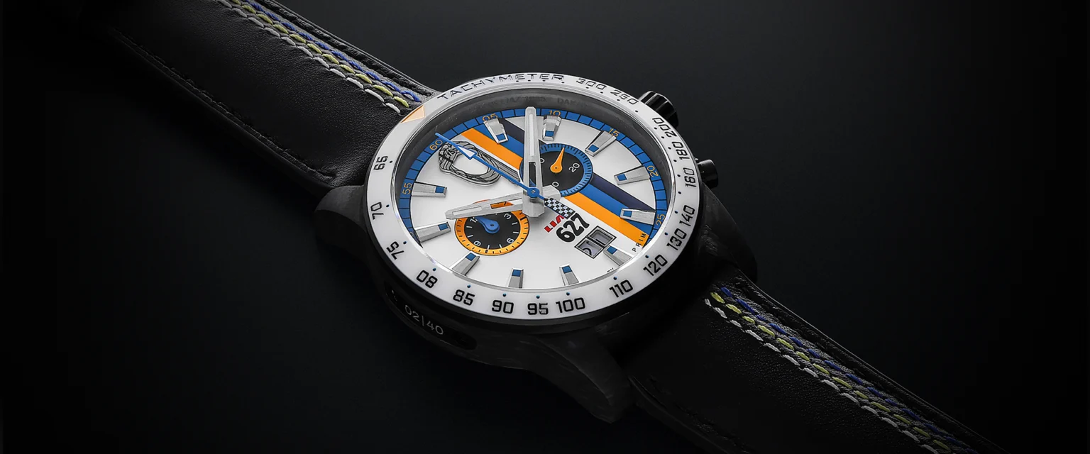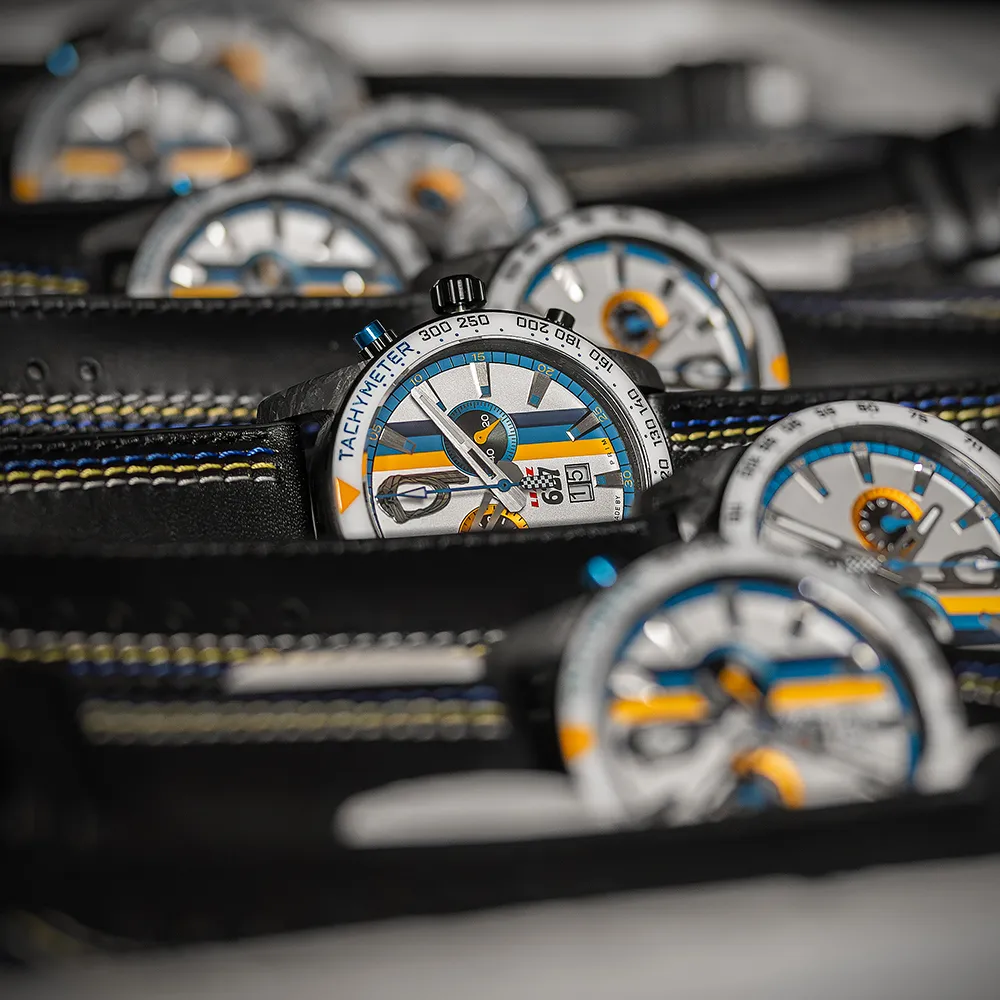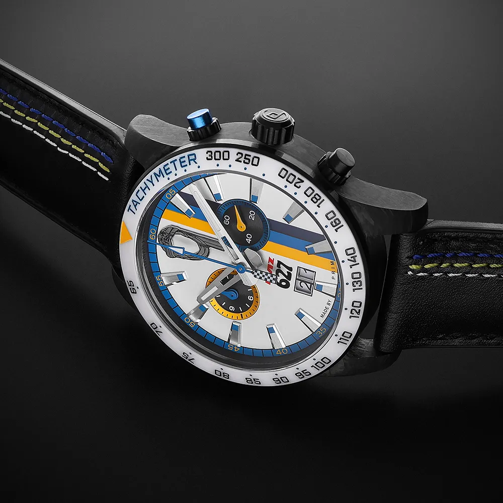 Výnimočné výročie si žiada výnimočné hodinky. Preto sme sa rozhodli použiť pre puzdro uhlíkové vlákno (karbón), materiál spojený s automobilovým a pretekárskym svetom. Každý kus je vďaka svojej štruktúre úplným originálom.