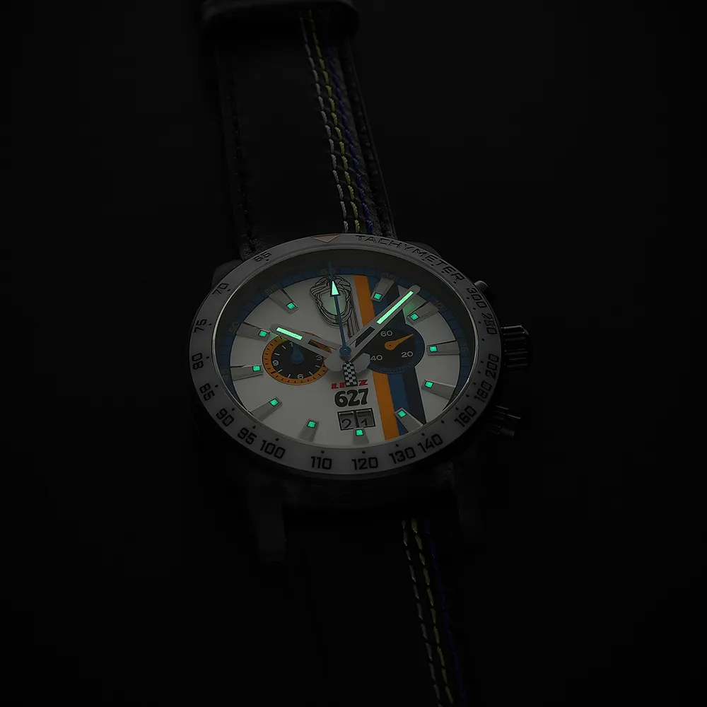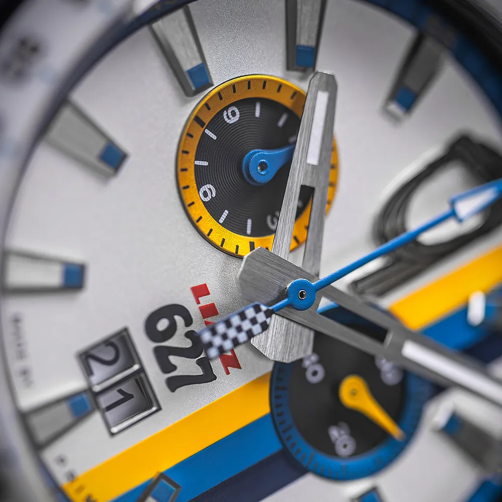 - Ručičky majú brúsený povrch a luminiscenčnú výplň, zatiaľ čo stopky chronografu zdobí šachovnicový vzor štart/cieľ.