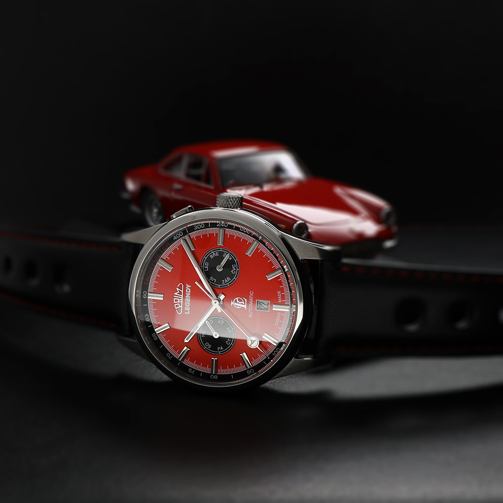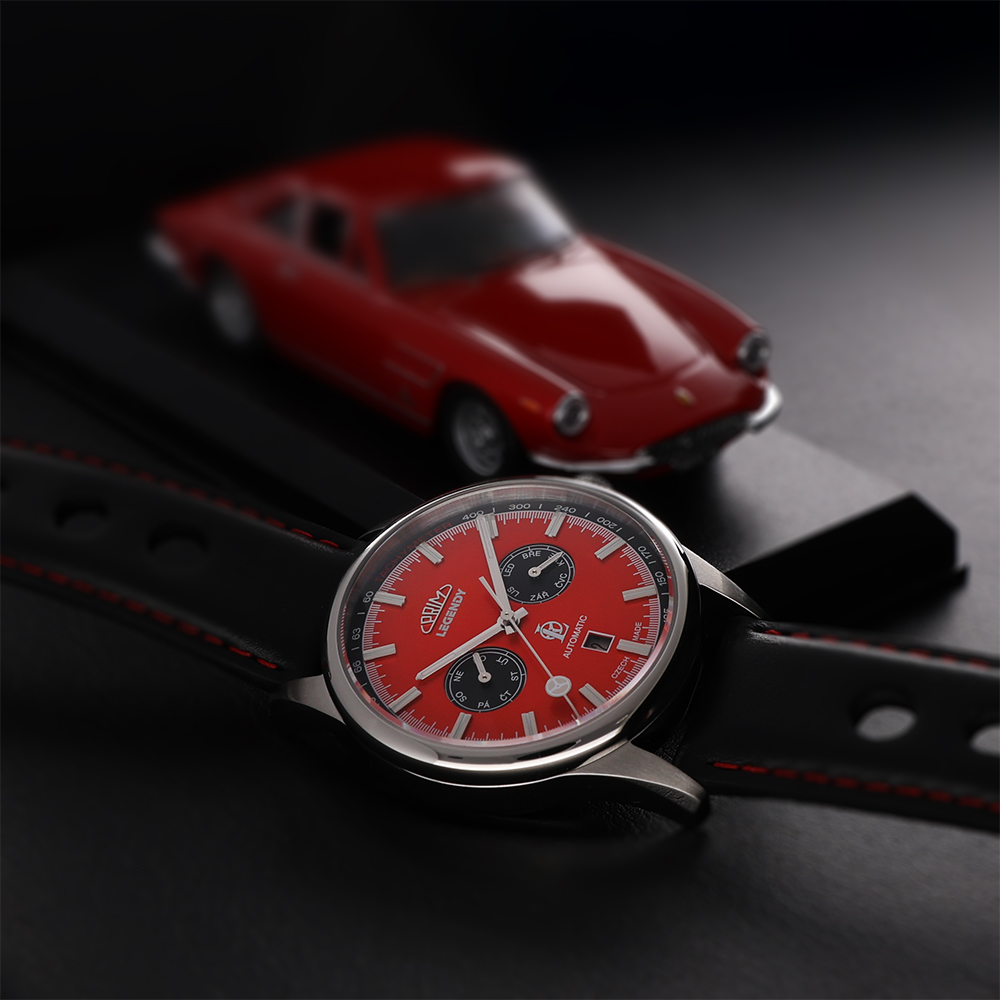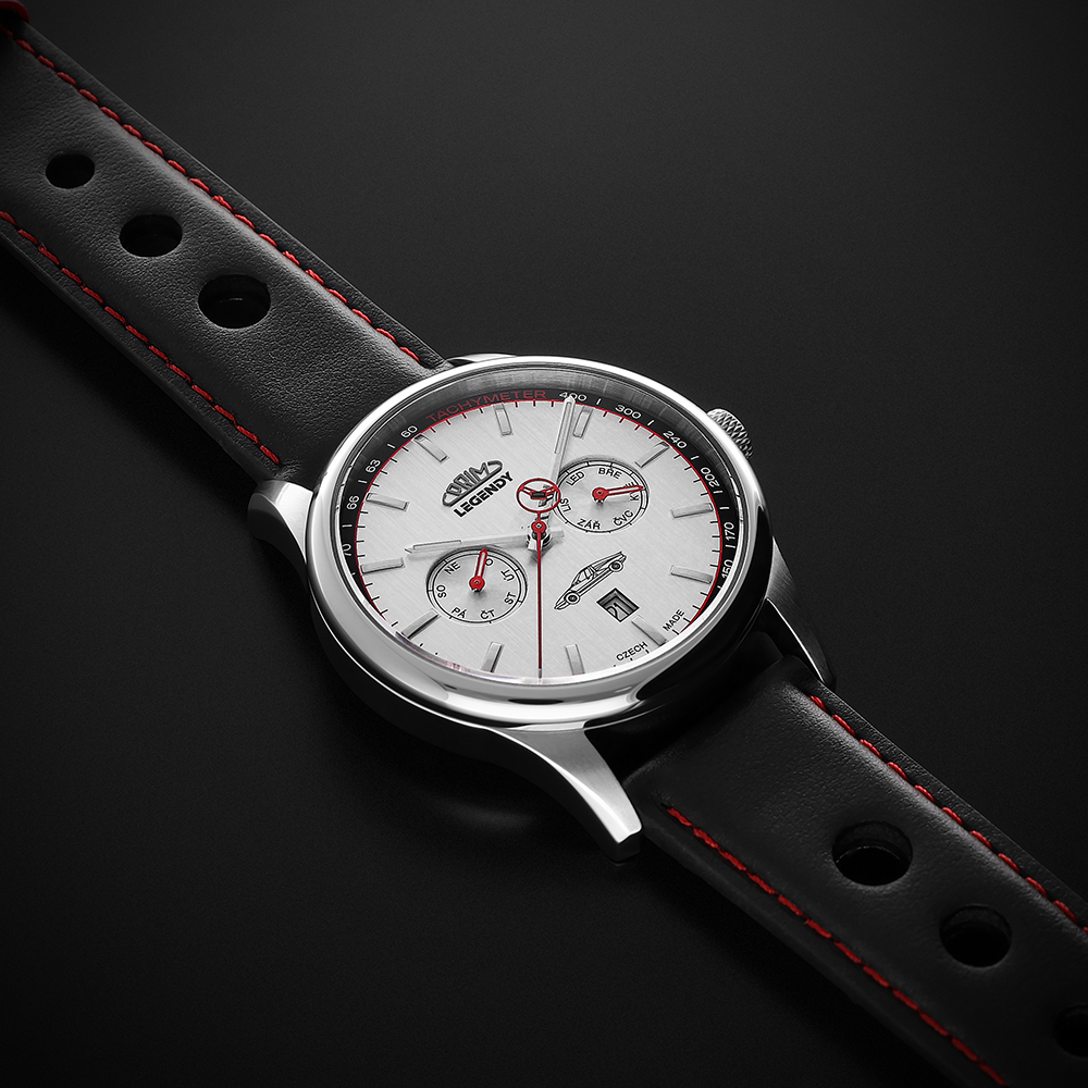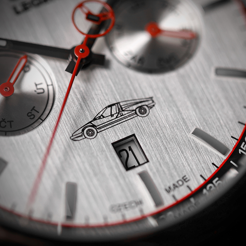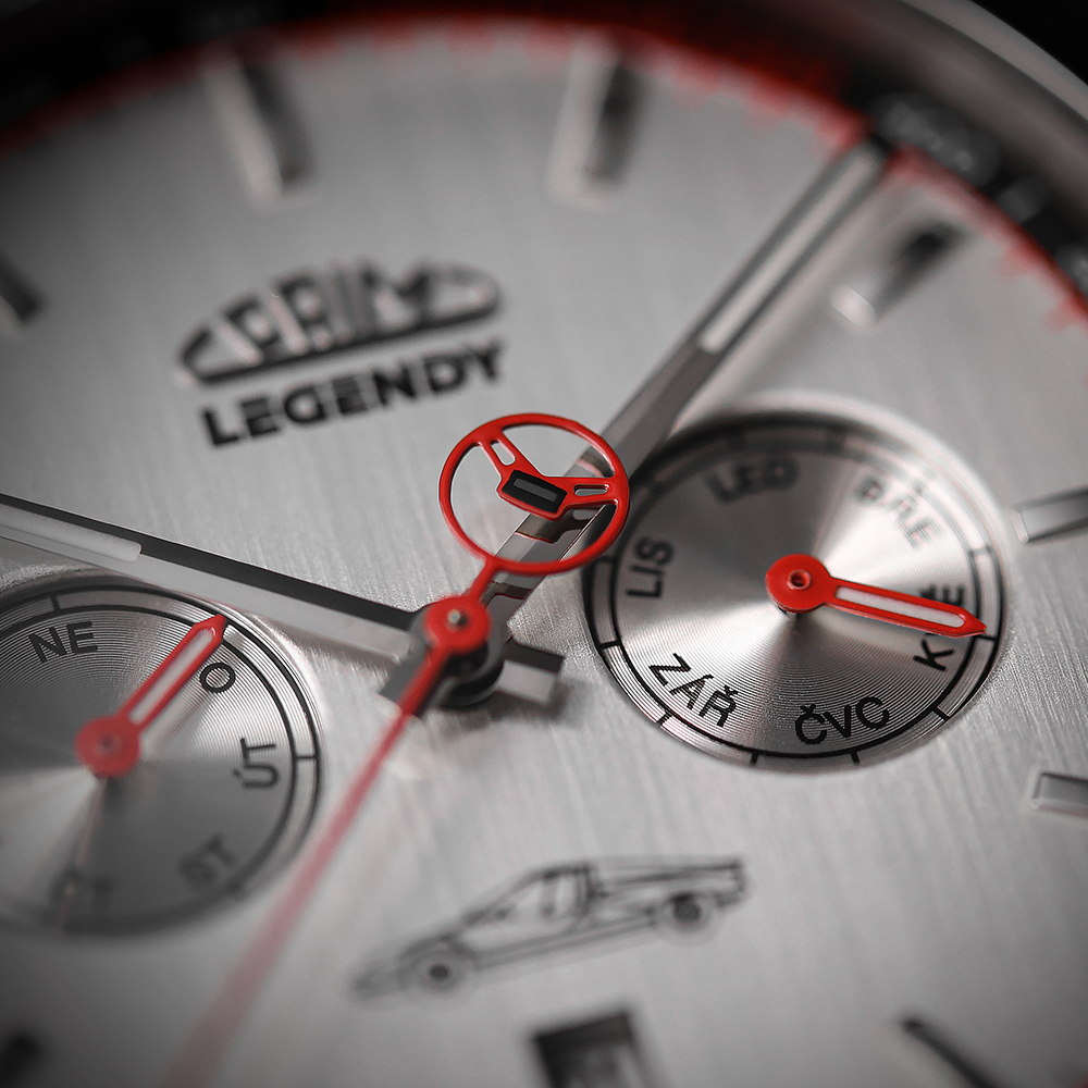 Dominantou modelu je výrazný červený číselník s brúseným efektom a plasticky vyvýšenými striebornými indexmi, doplnený čiernymi subčíselníkmi a kontrastnými luminiscenčnými ručičkami. Unikátnym dizajnovým prvkom je sekundová ručička zakončená štylizovaným symbolom volantu – odkazom na vášeň pre riadenie a automobilovú kultúru.