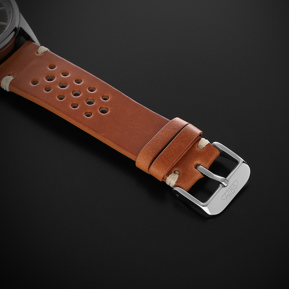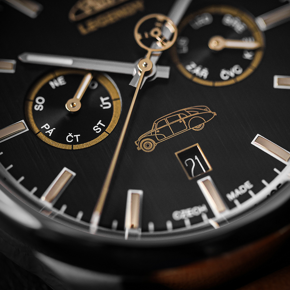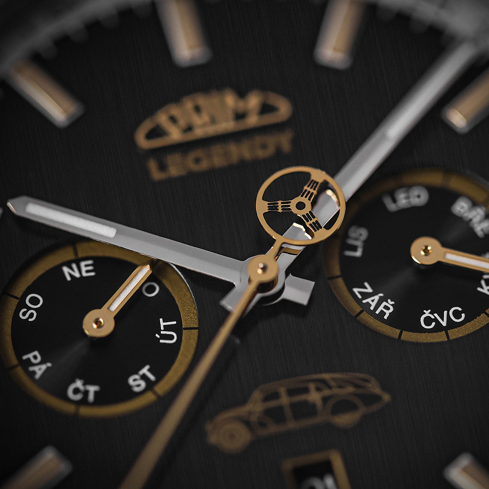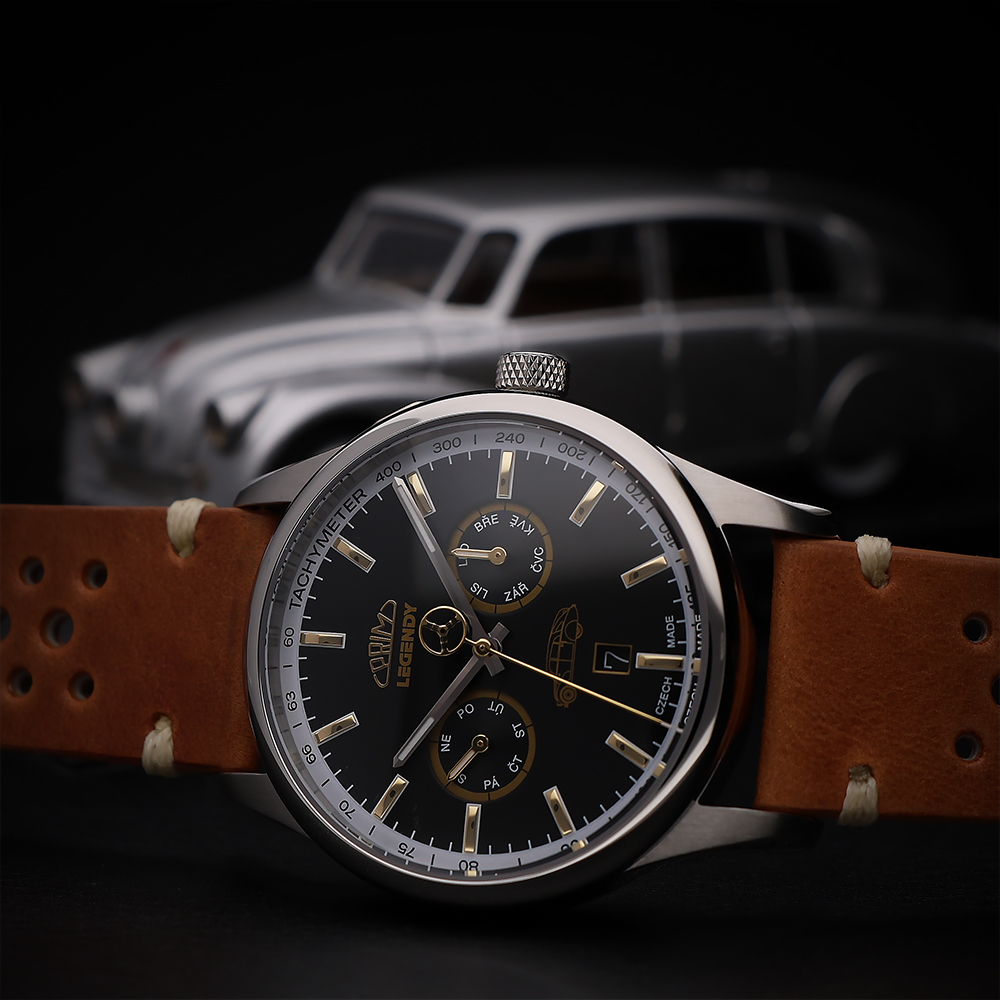 Model Tatra 87: Elegantný čierny číselník s jemnými zlatými prvkami vzdáva hold nadčasovej aerodynamike a luxusu slávneho cestovateľského vozidla prvej republiky. Zvolený hnedý remienok v štýle „Peanut Butter Vintage“ dodáva hodinkám retro nádych, ktorý dokonale ladí s estetickým odkazom slávnej Tatry. Je to decentný, klasický prvok, ktorý umocňuje dojem noblesy a histórie.