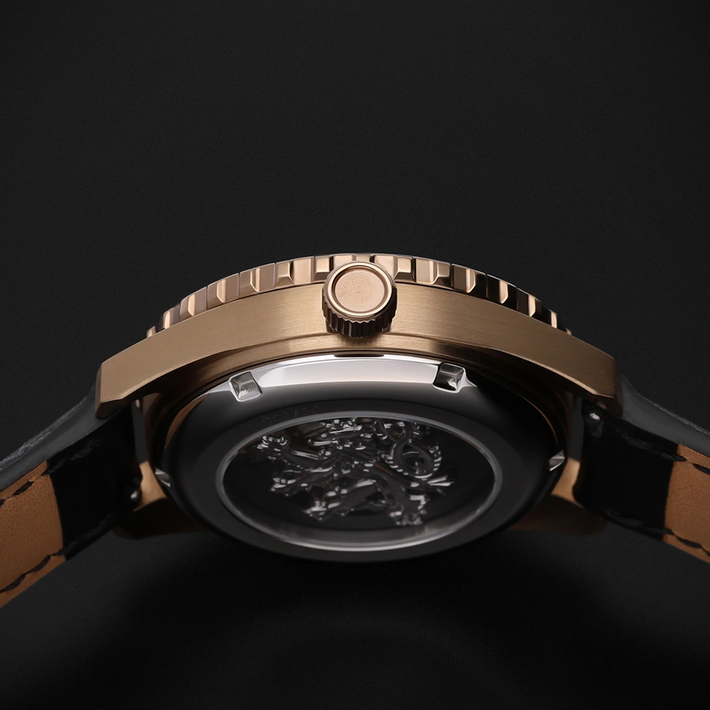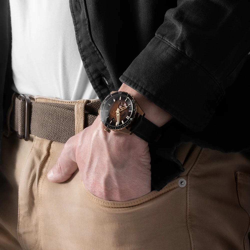 Čtvrtá varianta s pouzdrem v provedení IP povlakování do bronzu je dodávána na koženém řemínku. Součástí balení je řemínek z Hi-tech materiálu FKM, který vyniká svou hypoalergenní vlastností a odolností vůči teplu, potu i chemikáliím. Tento řemínek je velmi příjemný na dotek.