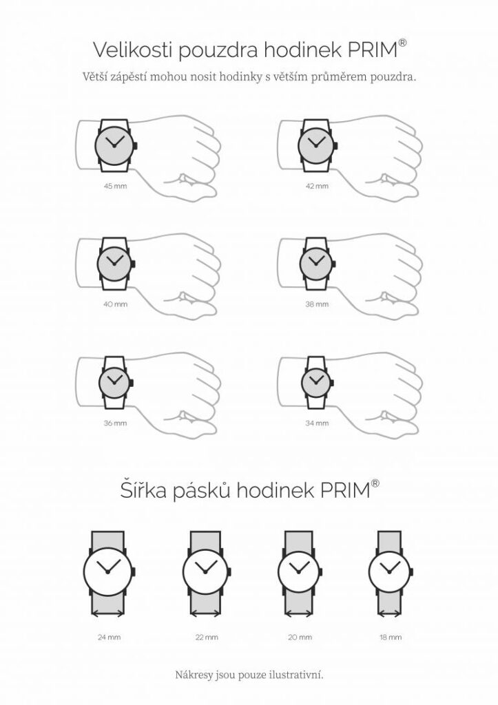 PRIM tabulka velikosti pouzdra hodinek, šířka řemínků