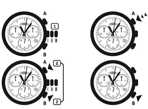 - Stiskněte tlačítka A a B současně po dobu minimálně 2 sekundy (sekundová ručka se začne otáčet o 360° → korekční režim je aktivován)