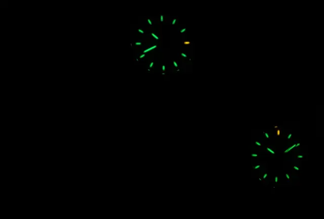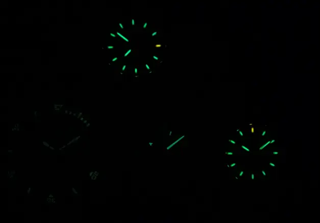 Hodinky byly vystaveny umělému světlu po dobu cca 30 vteřin a svítivost luminiscence je tomu úměrná.Další informace o ampulkách s tritiem v našich hodinkách naleznete v dokumentu Bezpečnost a záruka.