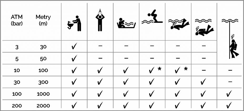 Výrobci hodinek uvádějí tři nejběžnější úrovně voděodolnosti: