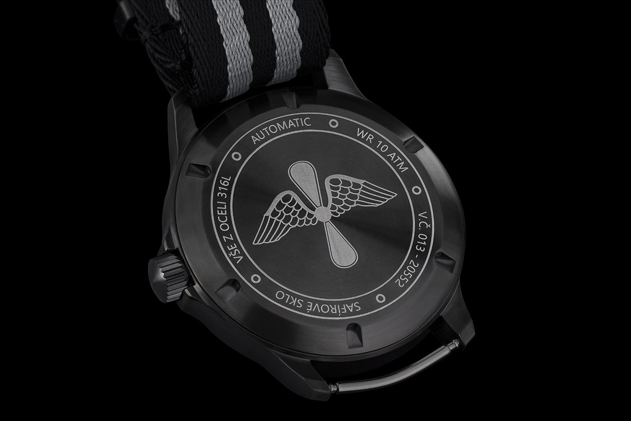 Dominantą pełnej tylnej pokrywy jest dwułopatowe skrzydlate śmigło, nawiązujące do początków czechosłowackiego lotnictwa cywilnego – symbol ten zdobił guziki przedwojennych mundurów pracowników CSA. Wodoodporność zegarka została zwiększona do 10 ATM, dzięki czemu model PRIM OK-A nadaje się do noszenia nawet w bardziej wymagających warunkach.