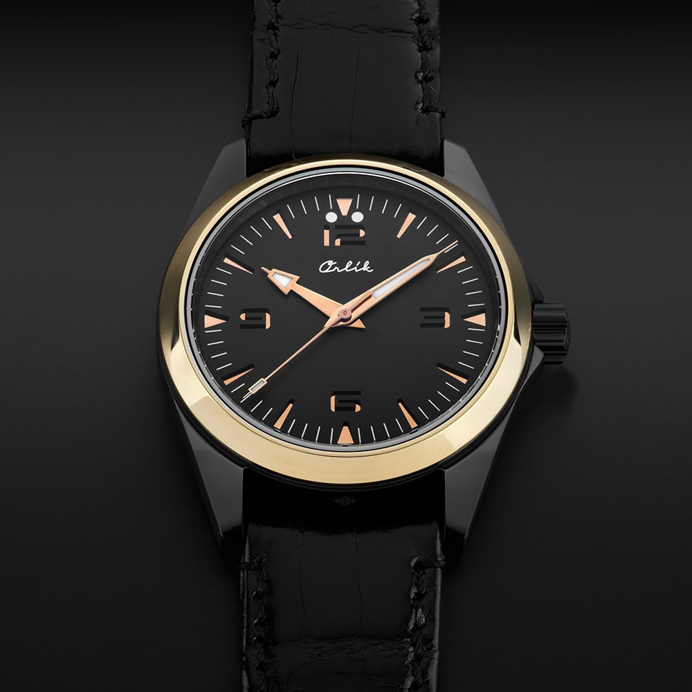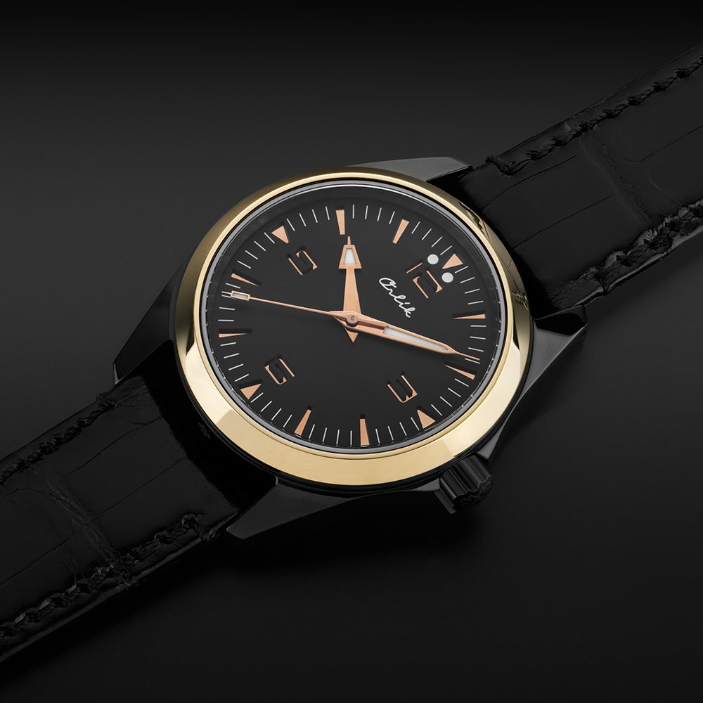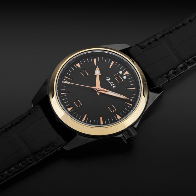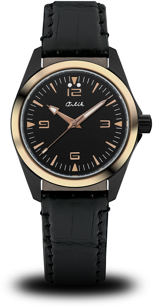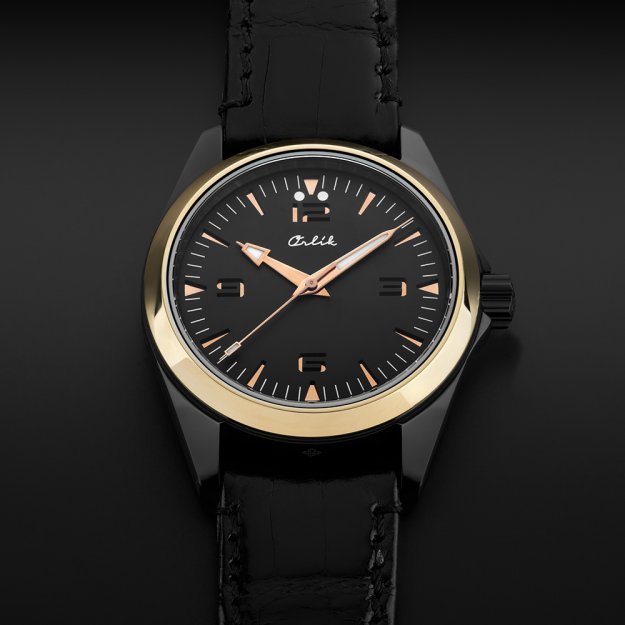 První model ORLÍK, který byl navržen a vyroben přímo pro dámy. Hodinkám vévodí nadčasová kombinace elegantní černé s detaily z růžového zlata. Díky skládanému skeletonovanému číselníku se podařilo docílit působivého kontrastního efektu. Subtilní nápis Orlík, netradičně vyvedený oblým ručně psaným fontem, dodává číselníku křehkost. Z temně černého pouzdra vystupuje leštěná luneta z růžového zlata. Minimalistický design se hodí pro každou příležitost. Na dámském zápěstí působí neodolatelně, atraktivně a nepřehlédnutelně. V kanceláři i v divadle, na procházce i ve městě.