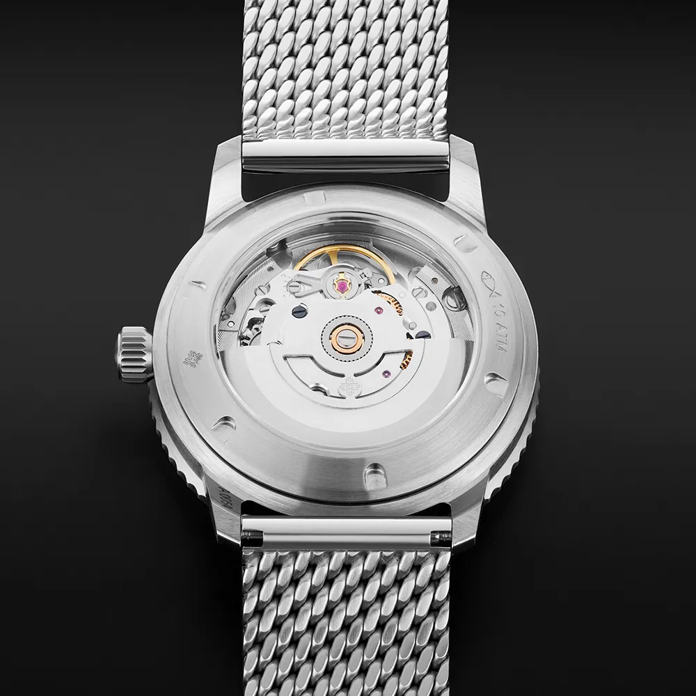 Srdcem tohoto modelu je kvalitní švýcarský strojek Sellita s frézovaným nosičem závaží zdobeným piktogramem. Detailně Kalibr 71 s automatickým nátahem (SELLITA SW200-1).